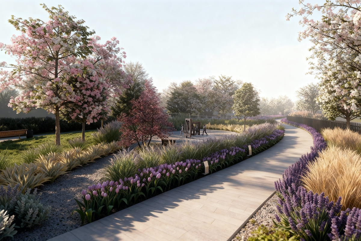 Різний характер просторів підкреслює рослинність: орнаментальні трави, багаторічники, плодові дерева, що квітнуть навесні та дають плоди восени. Значну частку становлять медоносні рослини, привабливі для комах. Деякі дерева та чагарники даватимуть дрібні плоди восени і залишатимуться на гілках взимку. Не буде газонів, що потребують косіння, — більші галявини засіюються сумішшю з низькорослою конюшиною.