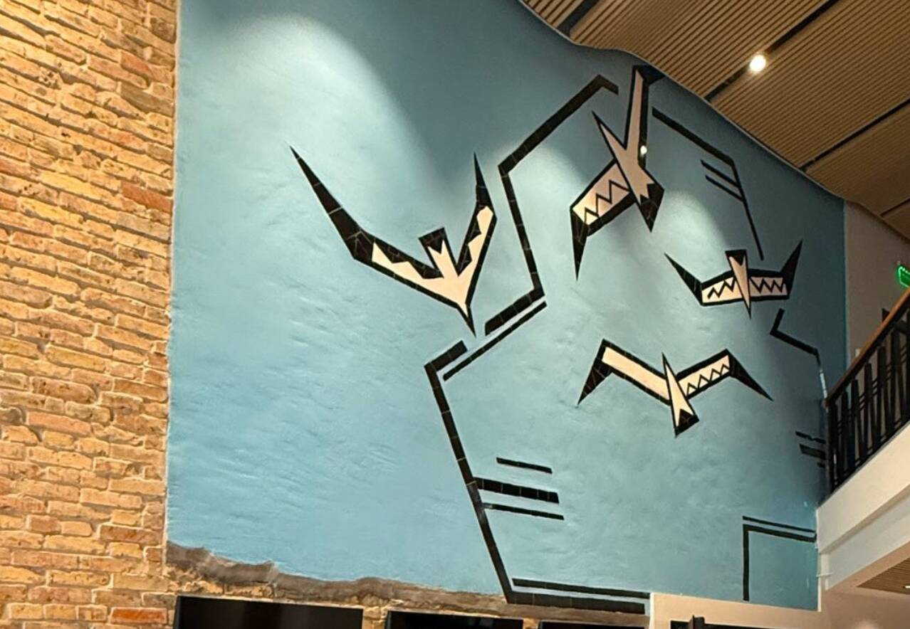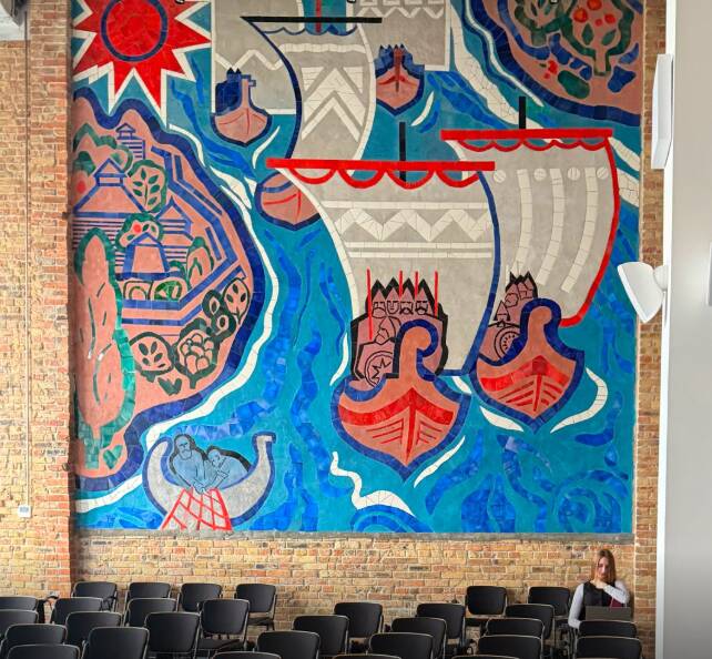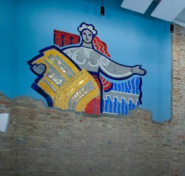 ГО «Спадщина» повідомила, що на Київському річковому вокзалі, де зараз знаходиться, American Universuty Kyiv, відреставрували мозаїки