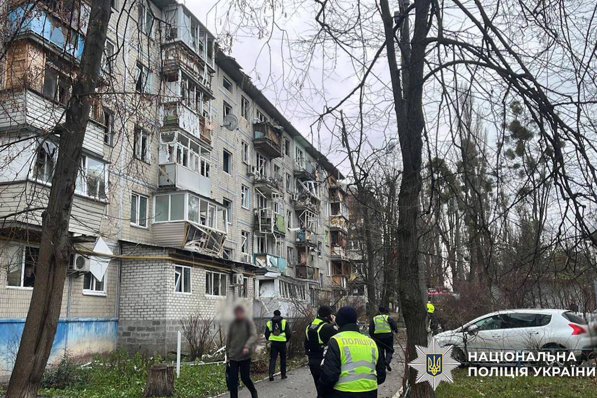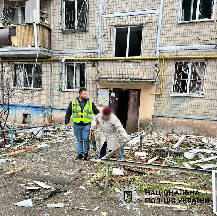У Святошинському районі уламки ворожого дрона впали у дворі п’ятиповерхівки. Пошкоджено фасад та вікна. Поранено п’ятьох людей, серед яких 16-річна дівчина. З осколковими пораненнями госпіталізовано 48-річну жінку, її стан — тяжкий.