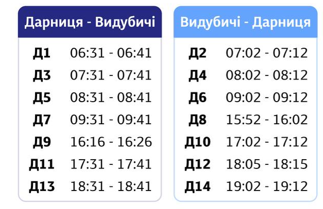 Додаткові рейси мають зробити поїздки між лівим і правим берегами швидшими та зручнішими. У розкладі ці поїзди позначені літерою «Д» — як додаткові. На станції Видубичі посадка й висадка пасажирів відбуватиметься з третьої колії.