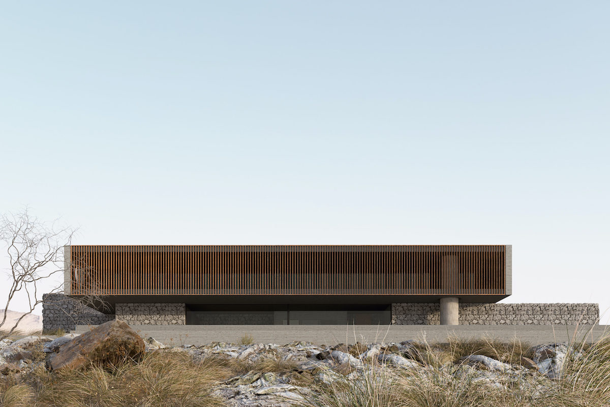 Основні матеріали — локальні породи, бетон, дерево та великі скляні площини.