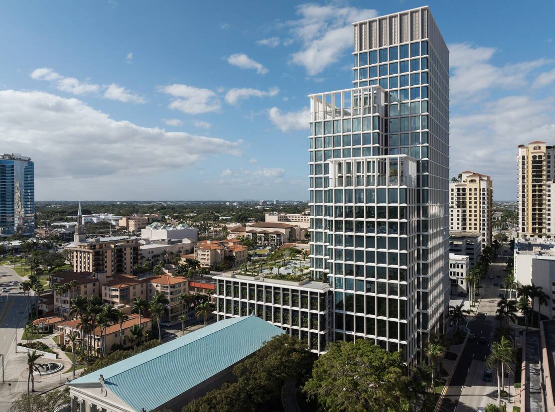 Хмарочос The One Flagler у Вест-Палм-Біч, Флорида від студії SOM, створений у стилі тропічного модернізму. Будівля обшита білим бетоном, фасад нагадує шпалери для рослин.