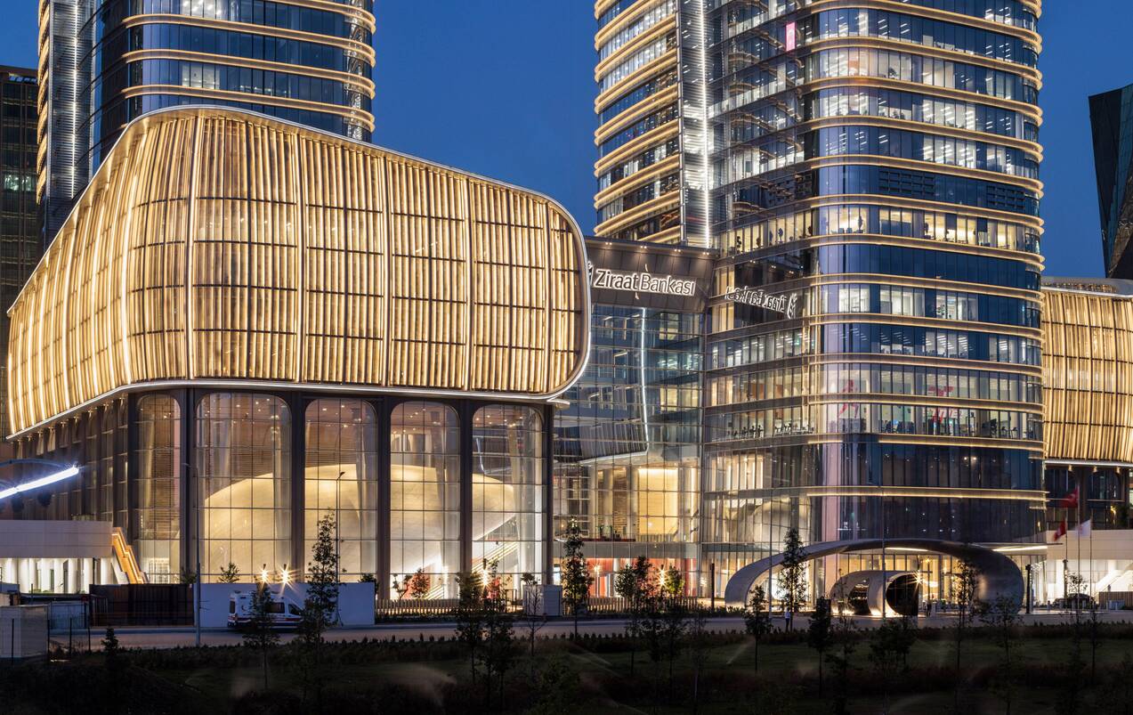 Подіум відсилає до традиційного декоративного стилю, а башти мають горизонтальні смуги. Форма будівель поступово розширюється до верху, створюючи скульптурний образ і підкреслюючи розвиток Ziraat Bank.