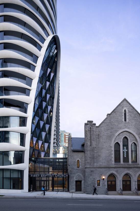 У Ванкувері студія Revery Architecture спроєктувала хмарочос Butterfly заввишки 178,6 метра з циліндричними формами, який інтегрує церкву початку XX століття у свою основу.