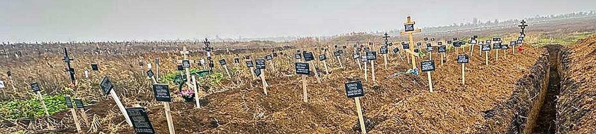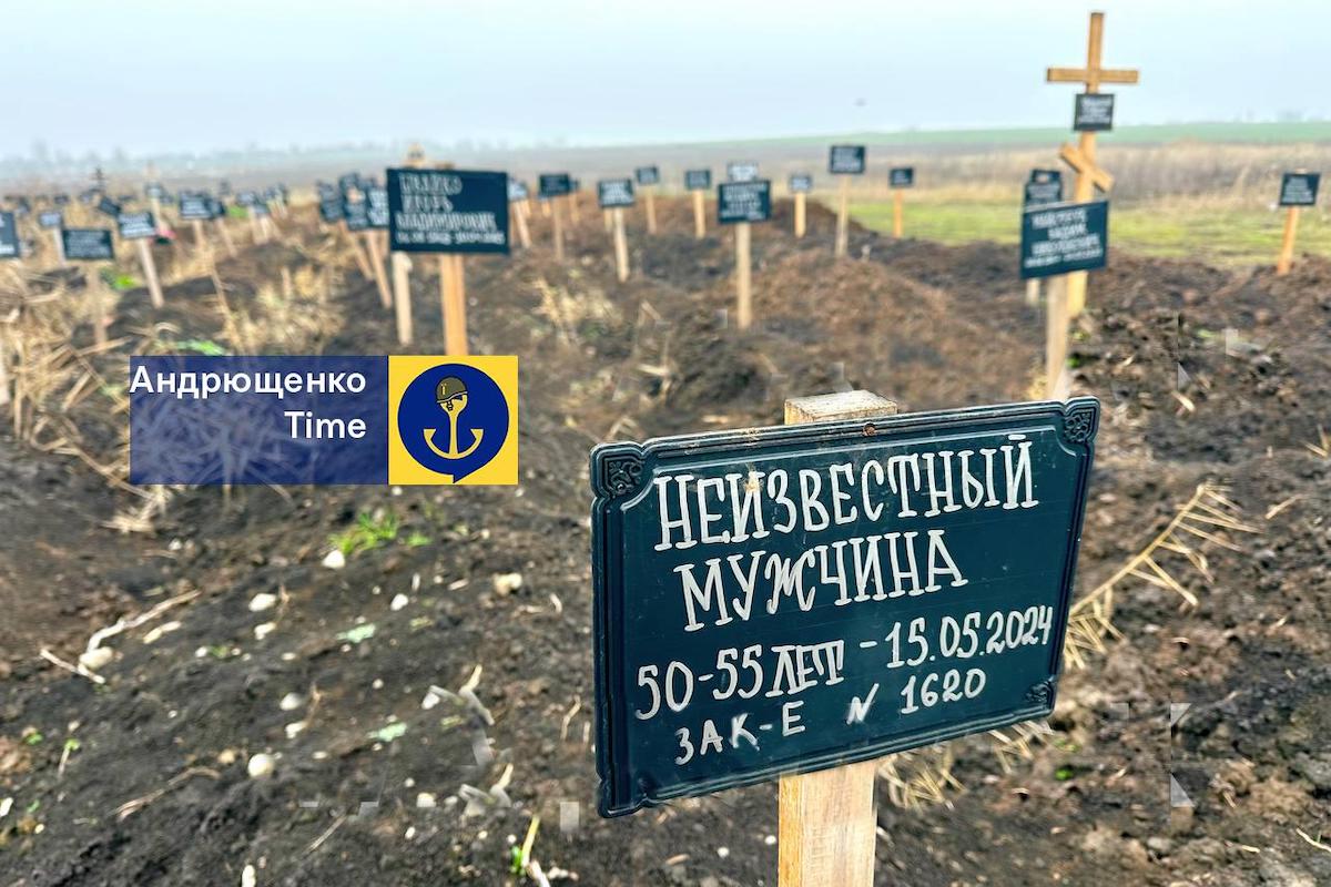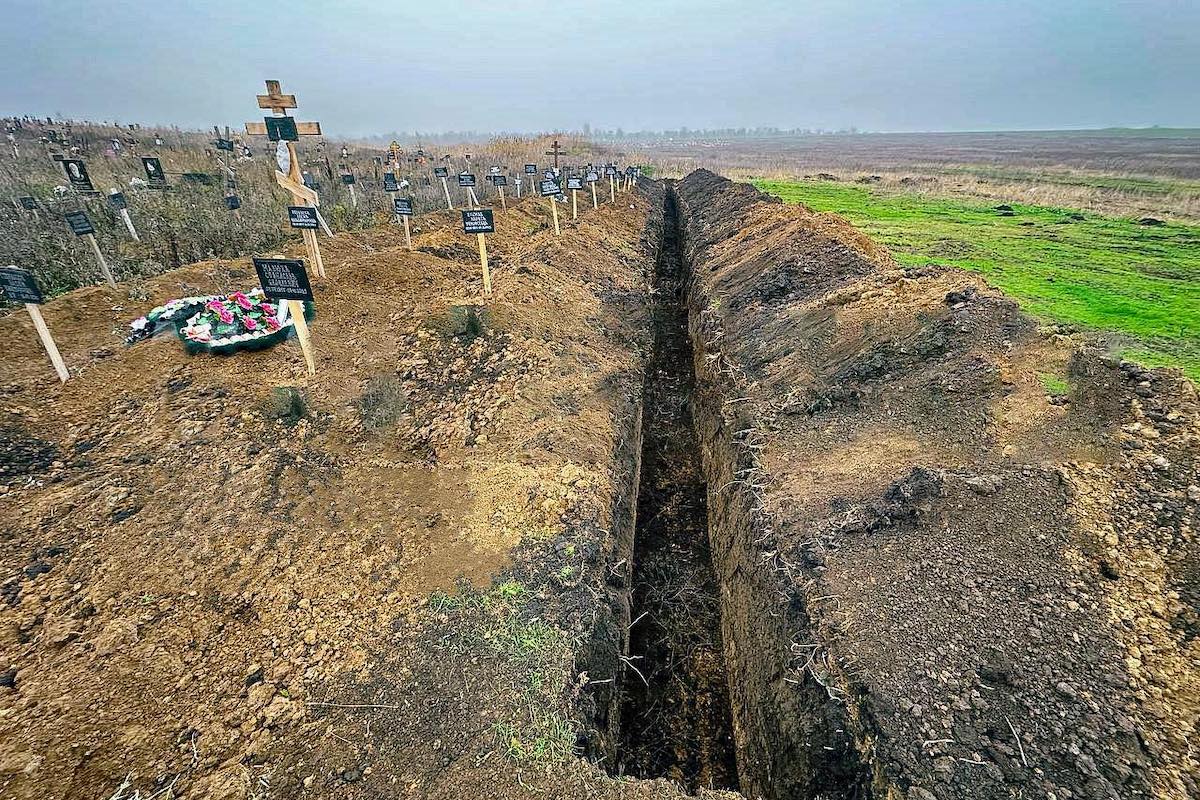 Останки перевозять на околиці та закопують у траншеях. На світлинах видно хрести з такими підписами, як «невідомий чоловік, 50-55 років».