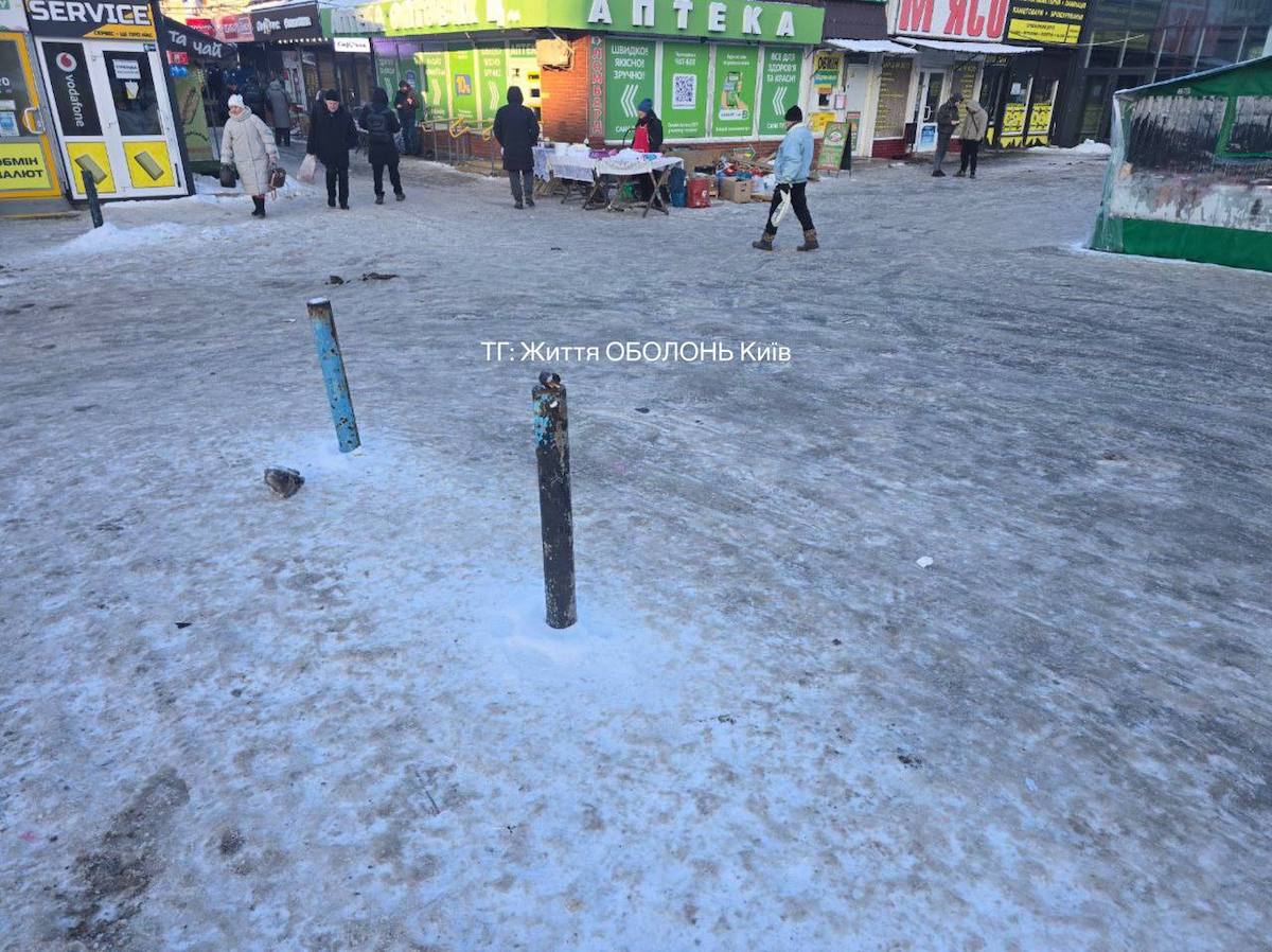 Соцмережі та телеграм-пабліки пишуть про слизькі тротуари. Наприклад, сторінка «Життя Оболонь» пише, що на слизькому тротуарі біля виходу зі станції метро «Оболонь» травмувався і знепритомнів чоловік.