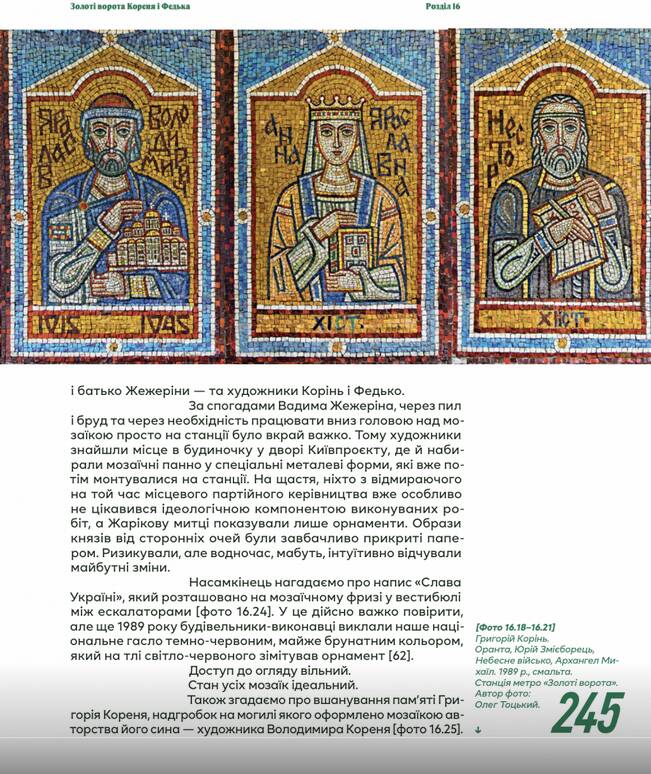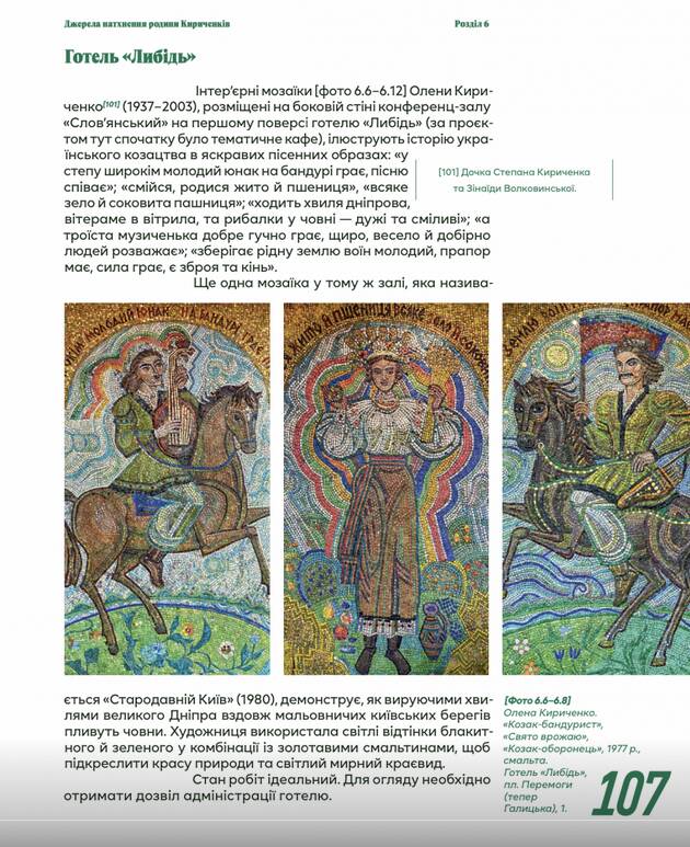 Особливу увагу авторка приділяє питанню – чому мозаїки радянського періоду важливі для культурної пам’яті Києва. На її погляд, ці об’єкти — матеріальне свідчення епохи. Кожна мозаїка створювалася на замовлення держави, але в цих рамках митці знаходили можливість додати щось своє, українське.