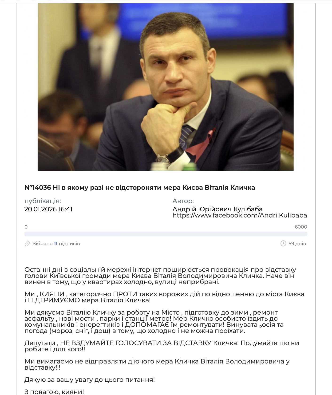 16 січня політичний оглядач Олександр Нотевський зареєстрував петицію з закликом до депутатів висловити недовіру Кличку та проголосувати за його відставку. Це звернення з невідомих причин не було допущено до голосування.