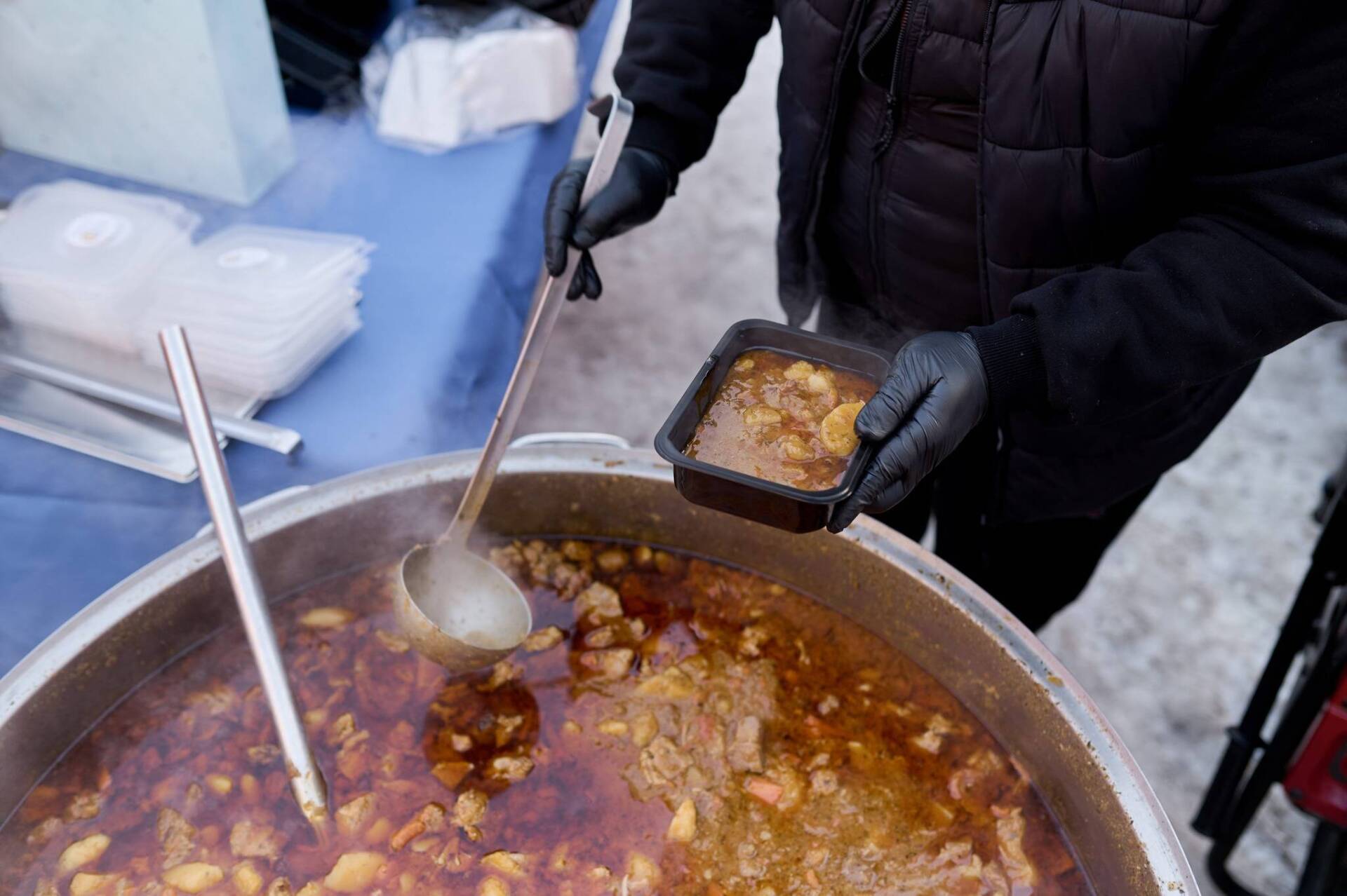 Благодійна організація World Central Kitchen розгортає в Києві «бограч-станції» — пункти, де роздають гарячий суп.