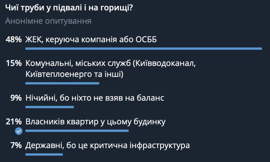 Не так багато киян знає, що внутрішньобудинкові мережі є спльіною власністю самих мешканців багатоквартирного будинку, пише депутатка Київради Ксенія Семенова, яка провела опитування у своєму телеграм-чаті. Лише кожен п’ятий відповів на запитання правильно.