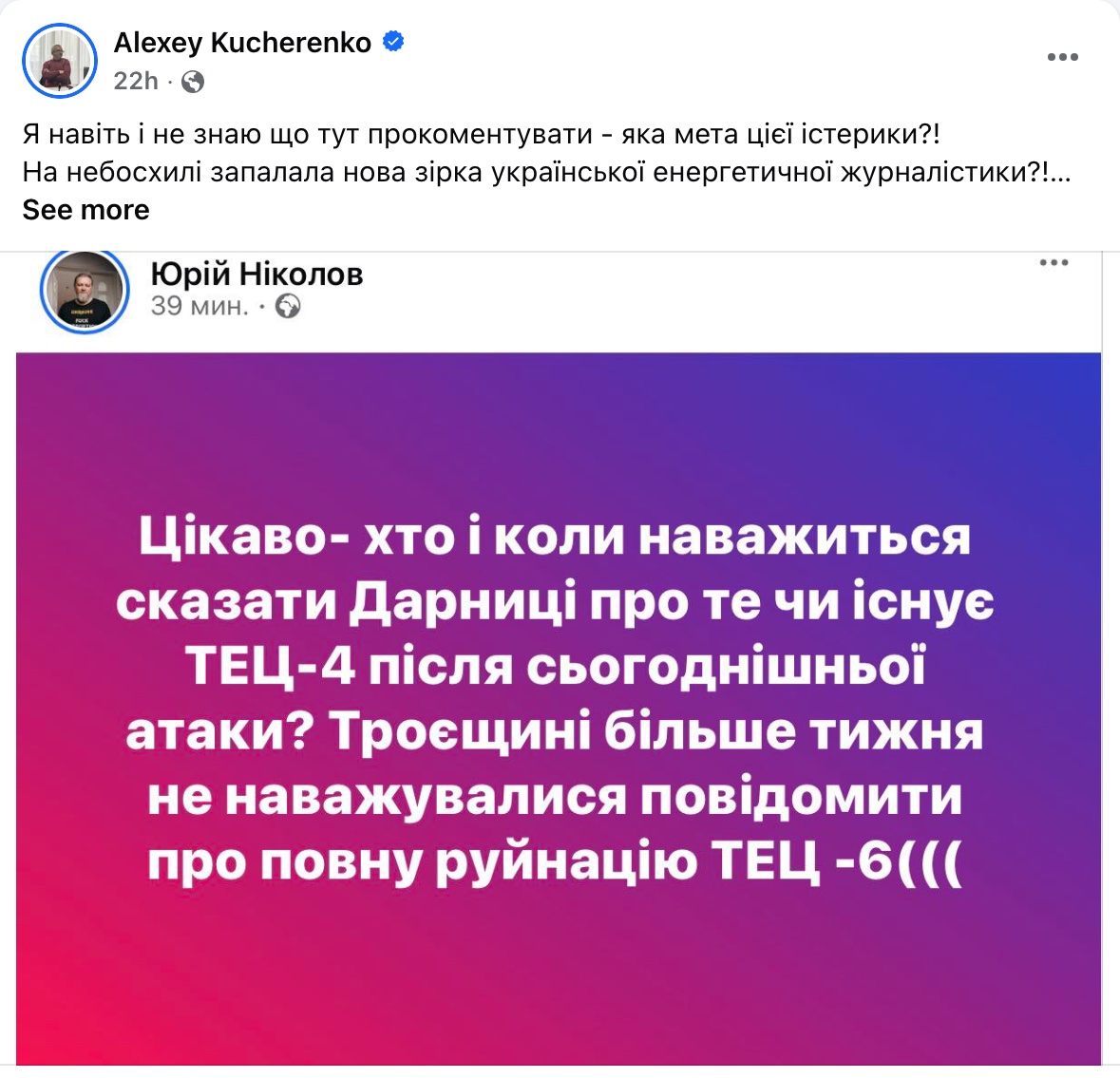 За даними КМДА, без тепла лишаються понад 1100 будинків у Дарницькому та Дніпровському районах. Попередні удари по ТЕЦ-6 залишили без опалення Троєщину, де довелося розгортати наметові містечка. У соцмережах обговорюють, наскільки критичними є пошкодження обох ТЕЦ. Депутат Олексій Кучеренко, який свого часу очолював міністерство житлово-комунального господарства, запевняє, що ТЕЦ-4 не зазнала «повної руйнації».