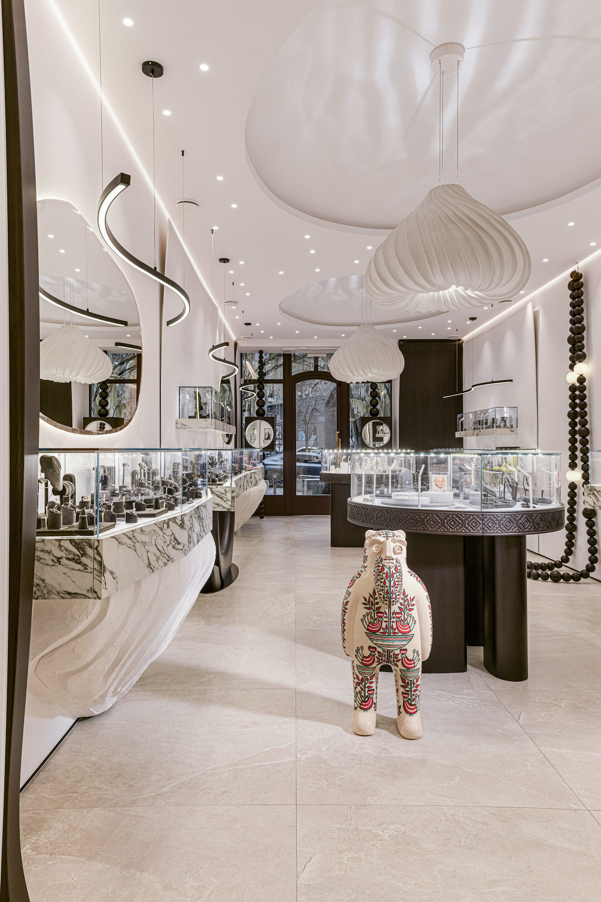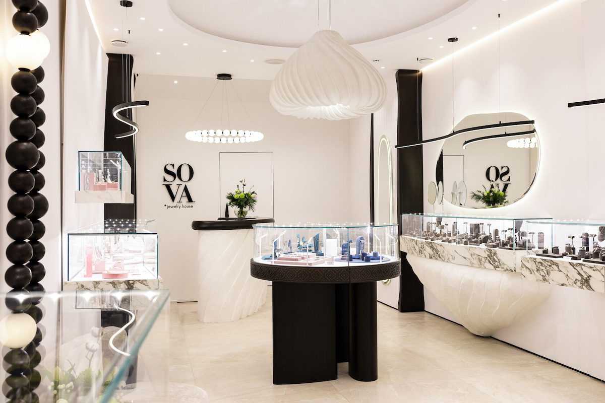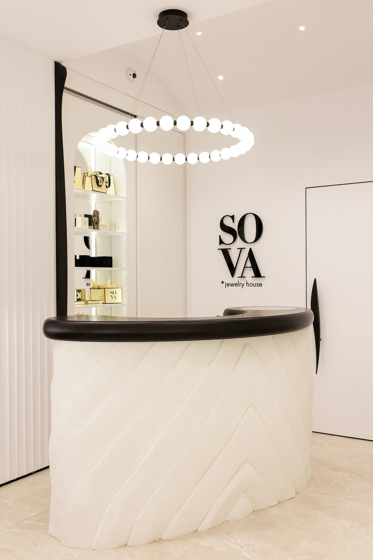 Makhno Studio розробила інтер’єр для бутика ювелірного бренду Sova у Києві. Це будинок, зведений у 1895–1897 роках за проєктом архітектора Владислава Городецького. В інтер’єрі використали мотиви хвиль і намиста. Точкові світильники, розкидані на стелі, нагадують мерехтіння діамантів.