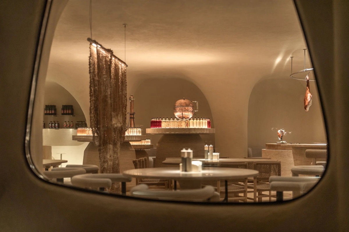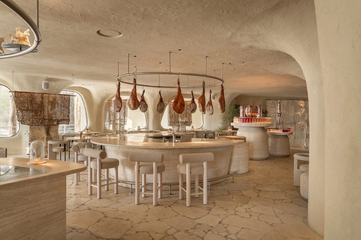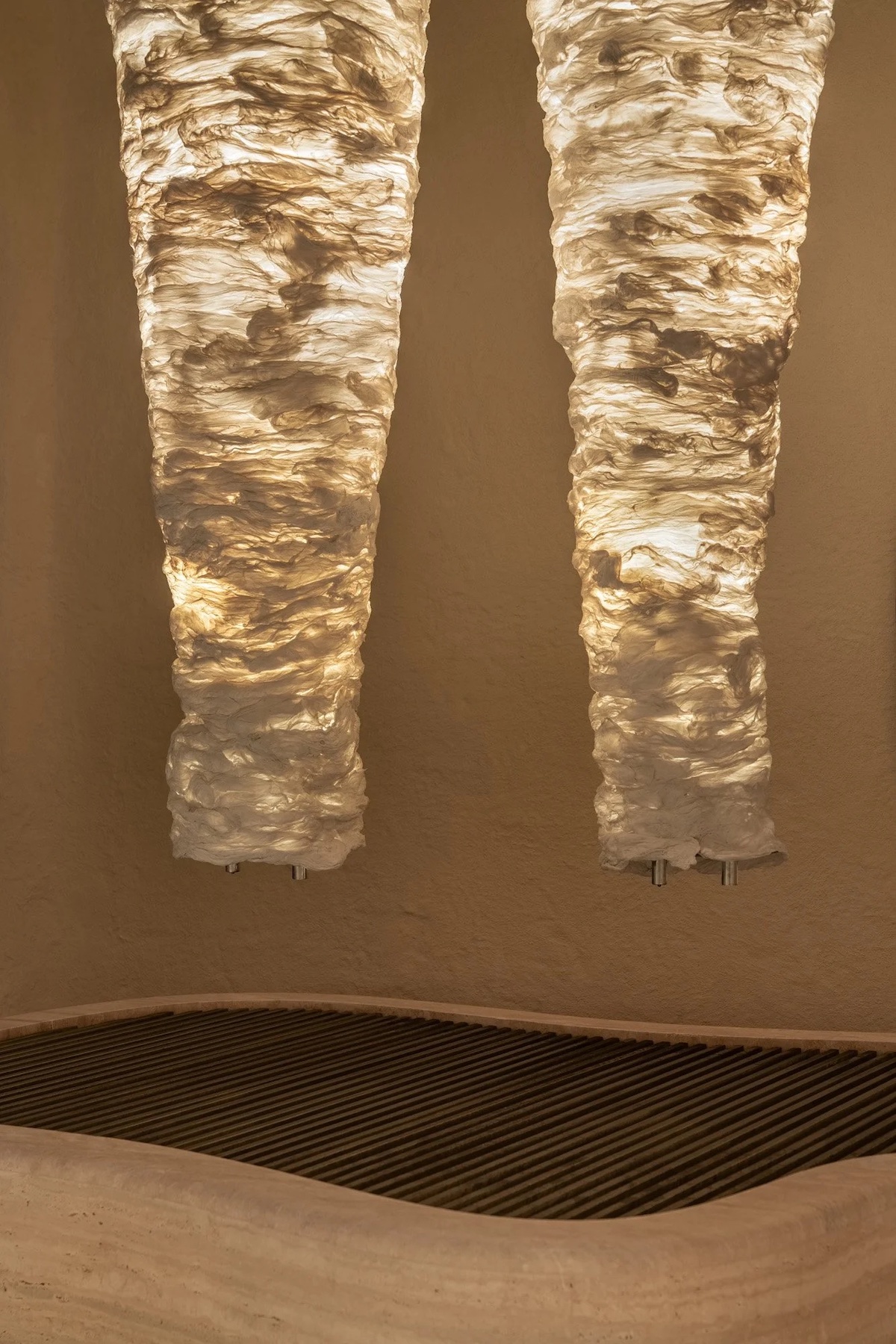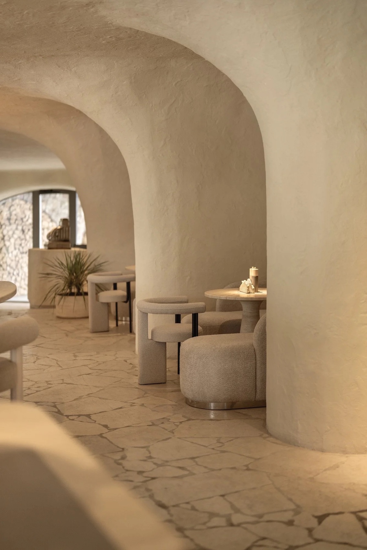 Простір характеризується біологічними вигинами та заокругленнями. Весь інтер’єр зібрано з двох матеріалів: фактурної штукатурки та локального травертину, що видобувають у кар’єрі поряд з Тернополем.