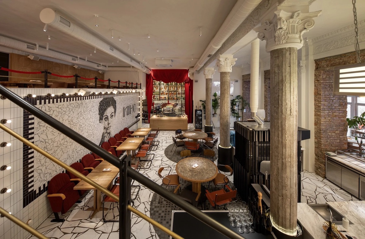 Інтер’єр ресторану «Кіно» в Миколаєві YOD Group бачила як поєднання естетики вінтажного кінотеатру та демократичного італійського ресторану. У приміщенні у 1950-х роках таки було розташовано кінотеатр. Щодо італійського колориту, що він походить із меню закладу, в якому готують піцу та середземноморську кухню. Бита плитка на підлозі продовжена мозаїчним панно з портретом Софі Лорен.