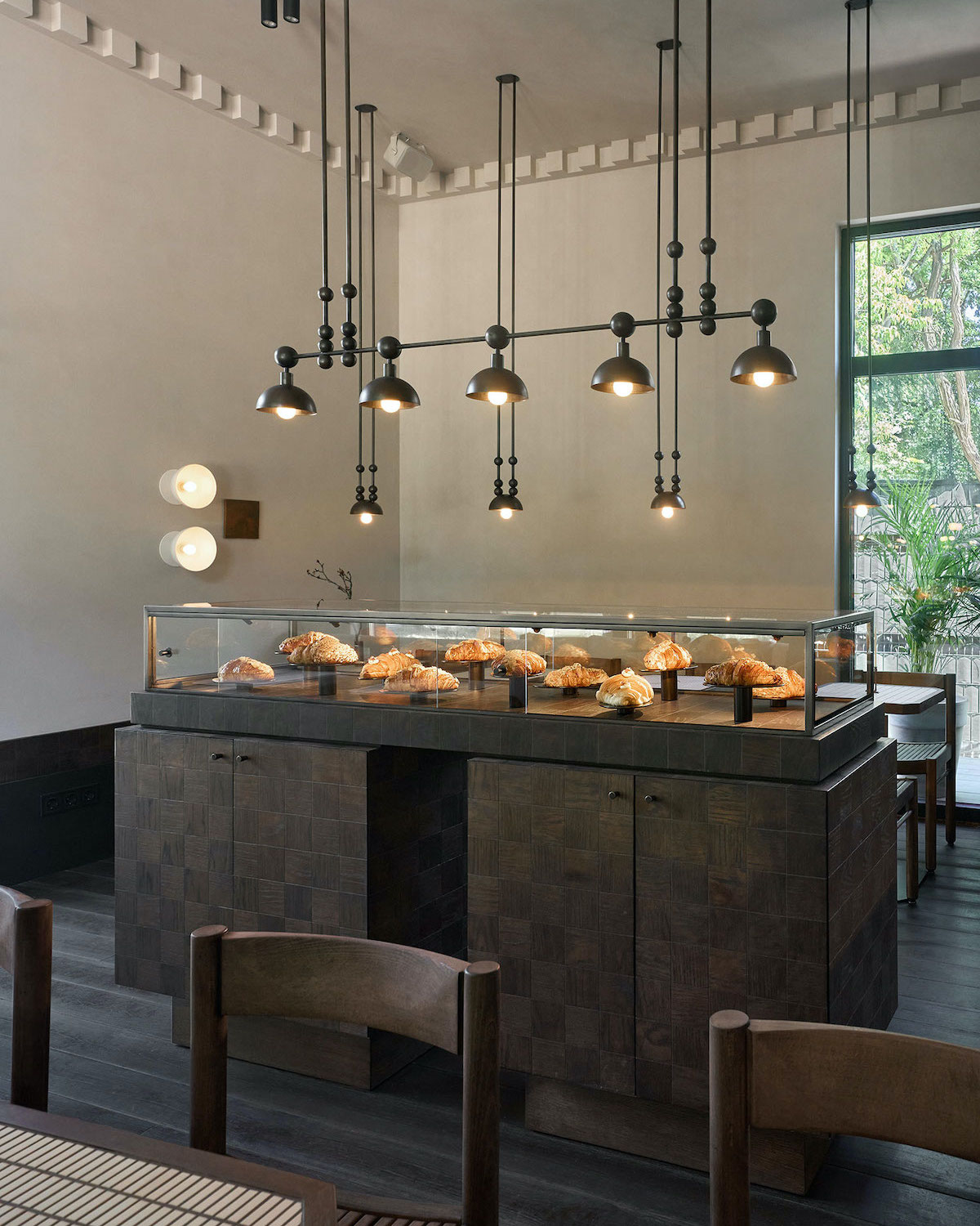 Центральну вітрину з круасанами підсвітили спеціальним освітленням, призначеним для вітрин ювелірних виробів. Стільці були знайдені на блошиному ринку та відреставровані.