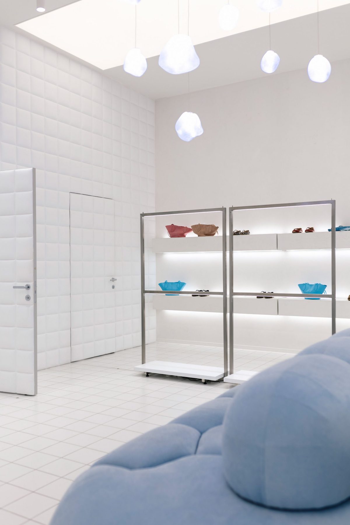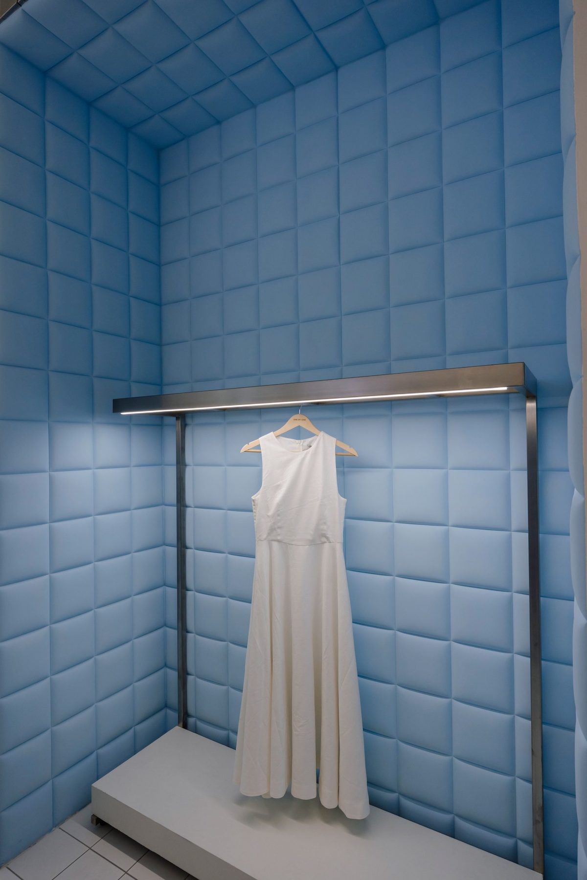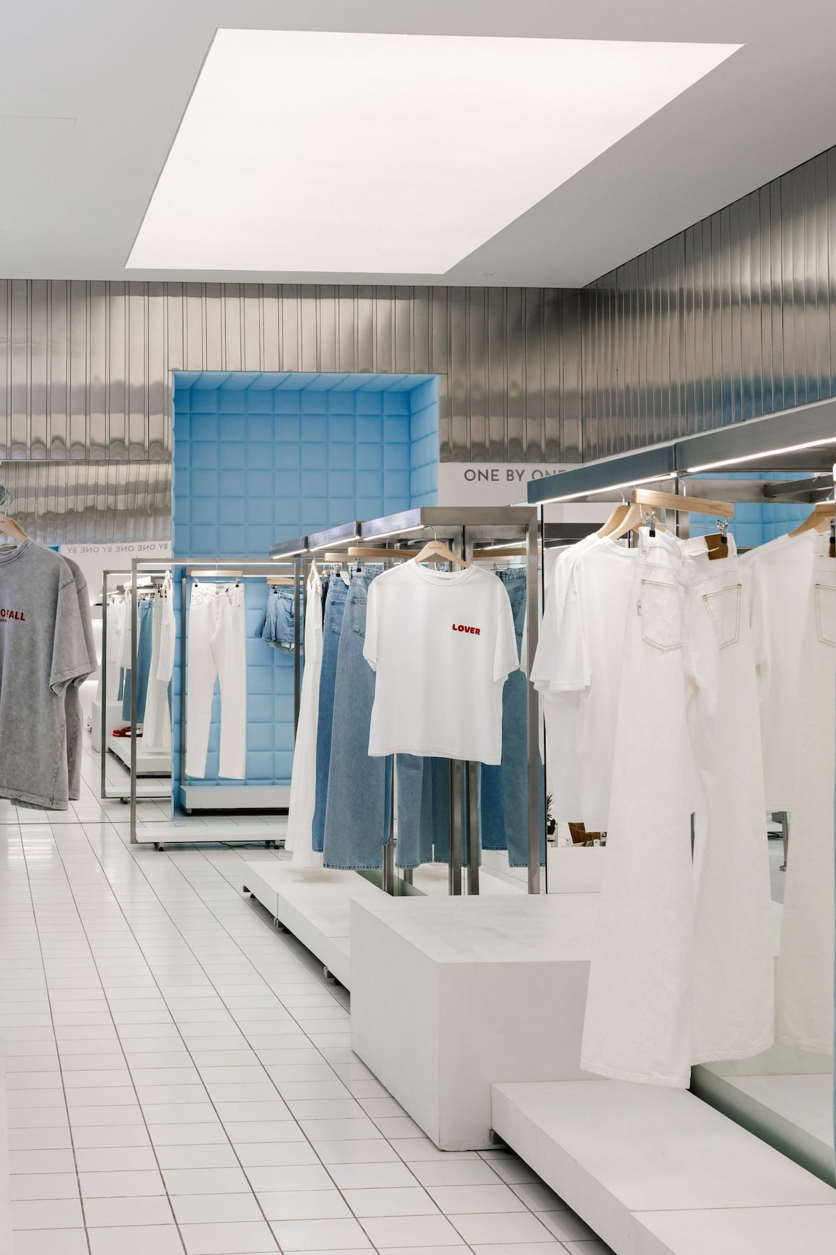 Студія Between the Walls розробила інтер’єр магазину жіночого одягу One by One, розташованого у київському ТРЦ Lavina Mall. Футуристична естетика досягається за допомогою металевих поверхонь, м’якої оббивки стін, мінімалістичної геометрії, поєднанням білого та блакитного кольорів.
