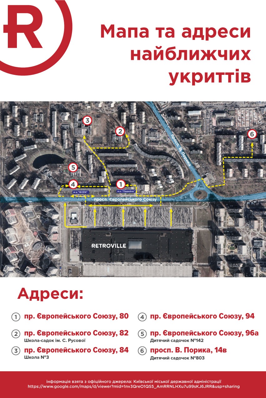 У ТРЦ Retroville, який був зруйнований через російський обстріл у березні 2022 року і відбудований, повідомили, що власного укриття в них також немає. «При оголошенні повітряної тривоги всі мають залишити ТРЦ і пройти в укриття. Карти укриттів розташовані на всіх виходах ТРЦ, а також на центральній площі. Дані про укриття взяті згідно з офіційними джерелами – сайту Київської міської ради», – відповіла Анна Держун, керівниця відділу маркетингу та реклами ТРЦ та бізнес-центр Retroville.