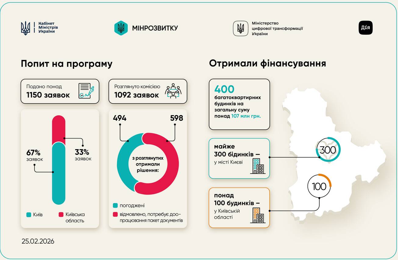 На участь у програмі вже подали свої заявки 1150 будинків. Дві третини звернень надійшли від киян, а решта 33% від мешканців Київської області