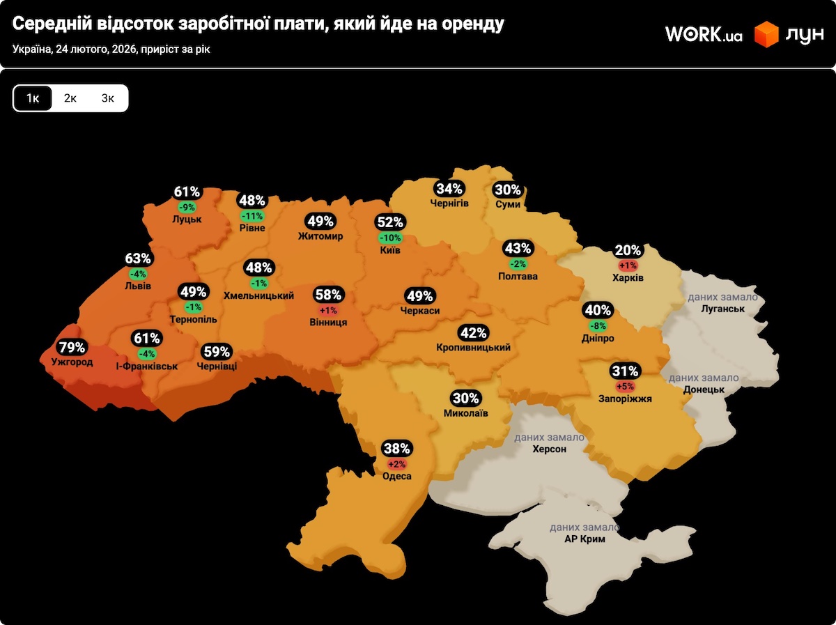 Ситуація з орендою ще складніша. У Харкові оренда однокімнатної квартири «з’їдає» приблизно 20% середньої зарплати, у Києві — близько 50%, у Львові — 60–80% залежно від професії.