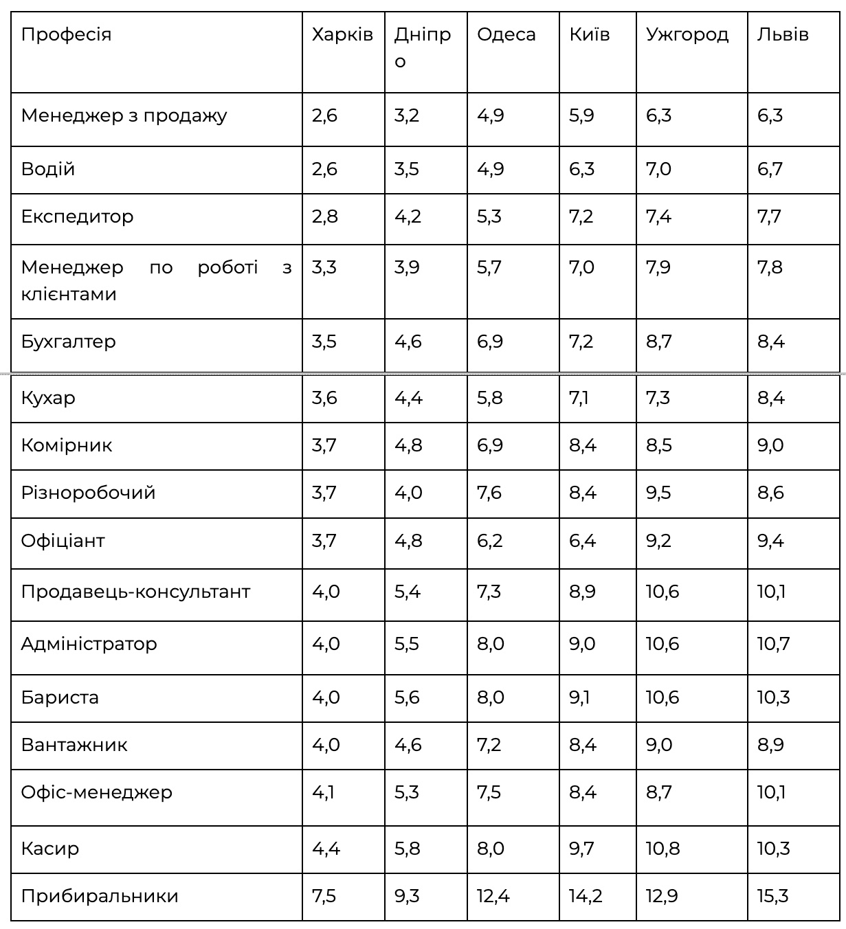 В Ужгороді баристи, касири та продавці мають віддавати 96–98% зарплати. Для прибиральників у Львові та Ужгороді оренда перевищує 100% місячного доходу.