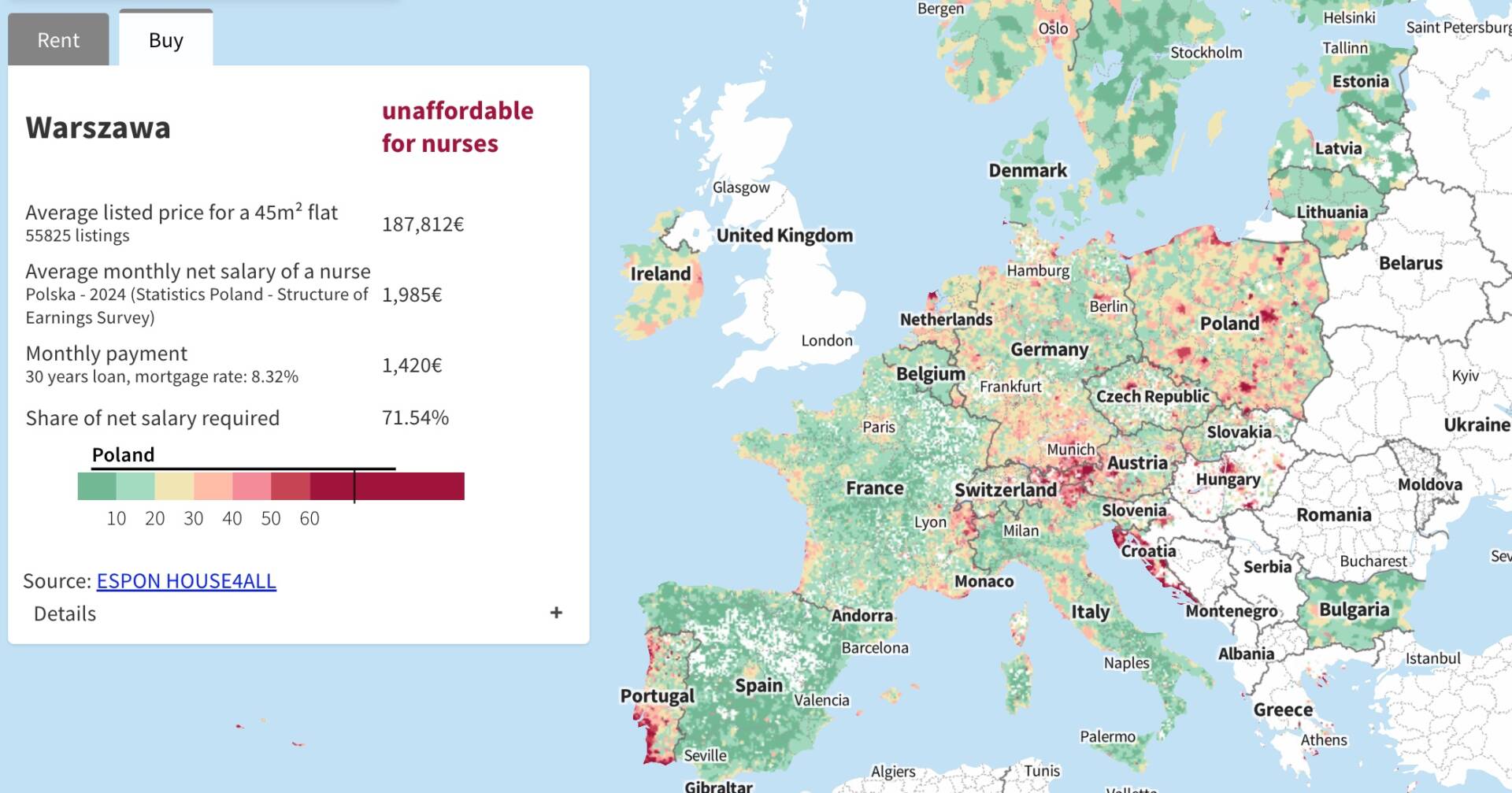Іншу аналітику на цю тему розробила CORRECTIV.Europe — порахувавши, наскільки доступною є оренда або купівля житла в різних регіонах Європи для медсестр. Медсестер обрали як репрезентативну професію, критично важливу для функціонування суспільства. Крім того, зарплатня медсестер у Європі приблизно відображає медіанні доходи. Так, у Німеччині медсестри отримують у середньому 4329 євро, що майже ідентично до медіани всього населення.