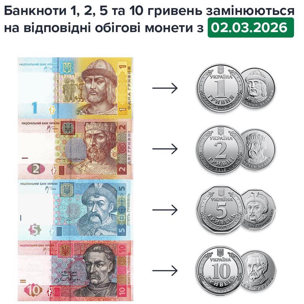 Відсьогодні, 2 березня, банкноти номіналами 1, 2, 5 та 10 гривень замінюються на відповідні обігові монети, повідомляє пресслужба Національного банку України.