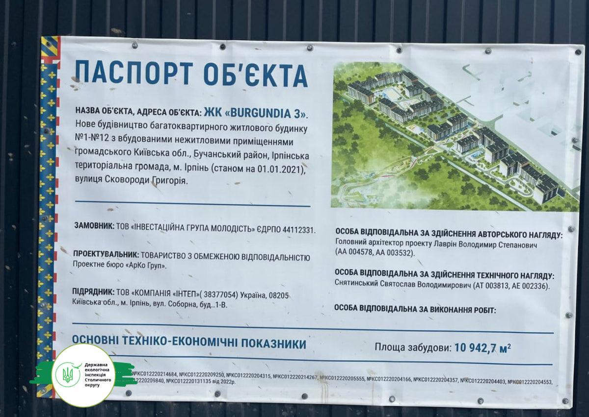 Житло будує компанія «Молодість», генпідрядник — «ІНТЕП». Екоінспекція також публікує інформаційний щит із будмайданчику та надає координати місця зливу, які вказують на ЖК Burgundia 3.