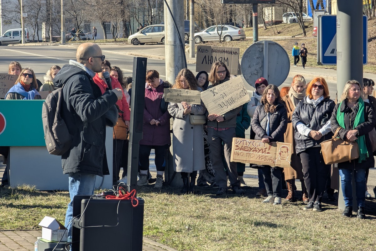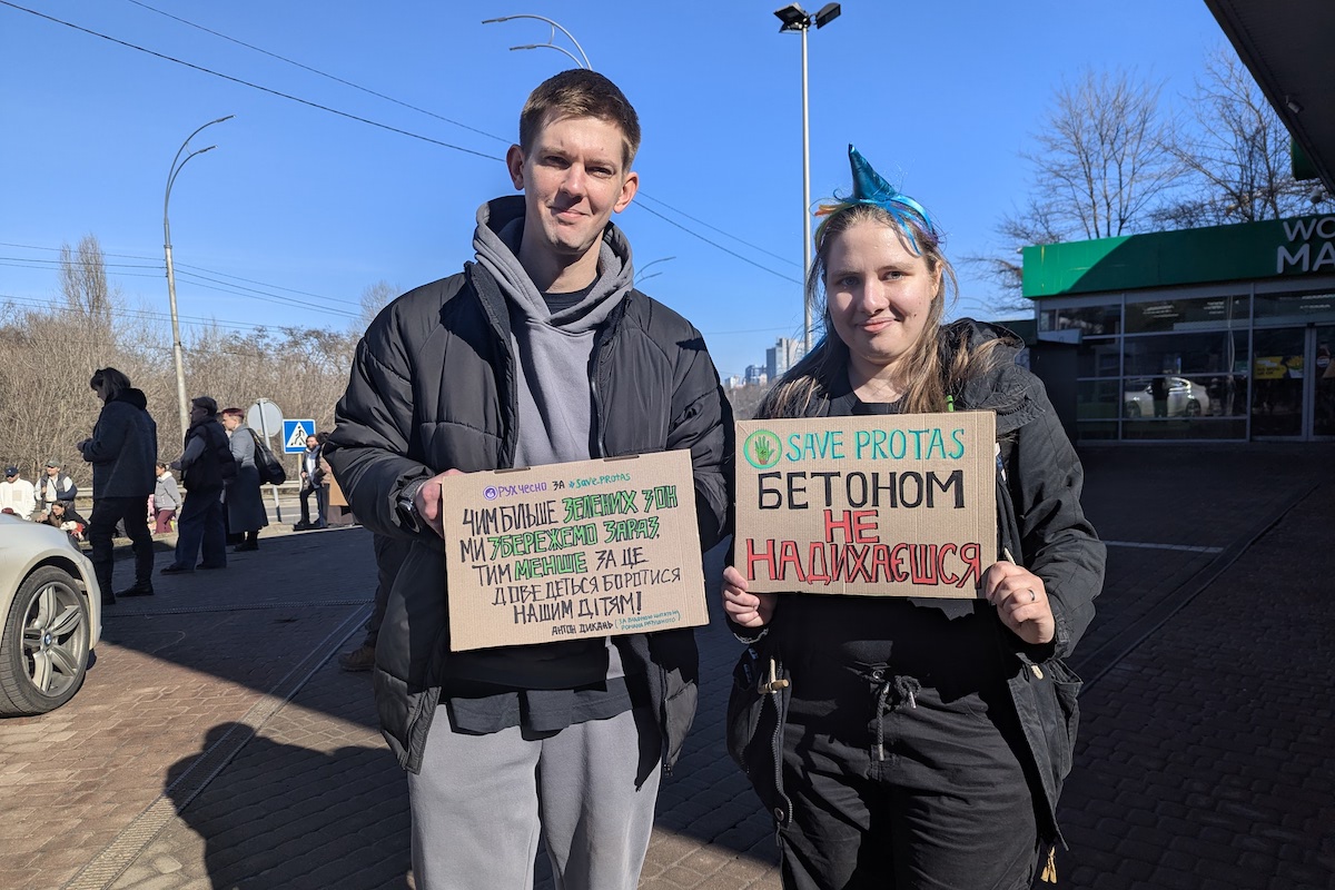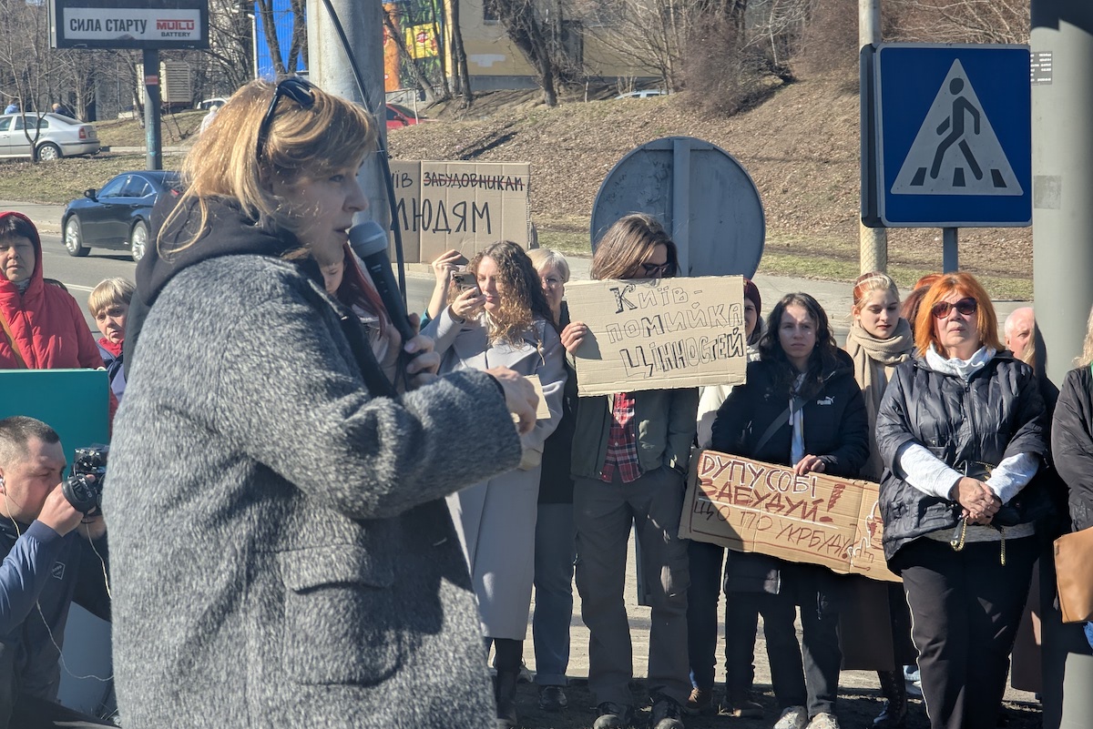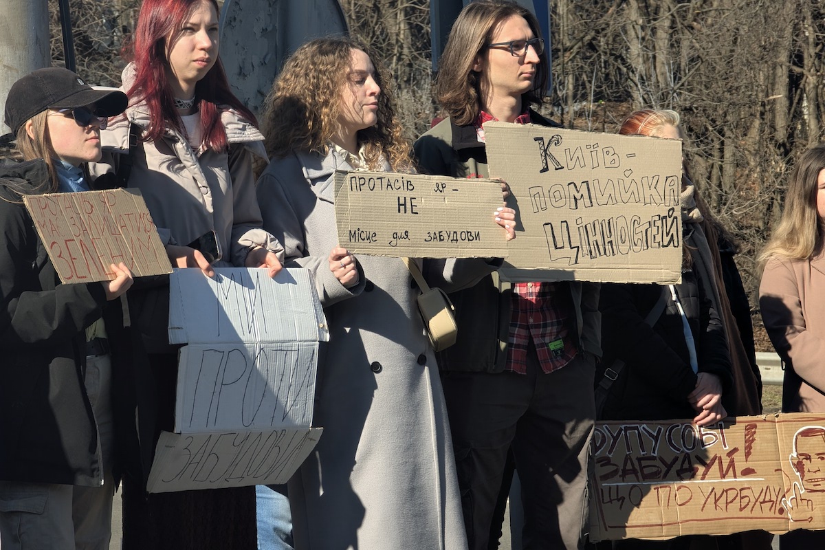 «У нас по Києву багато недобудов, якими все одно ніхто не займається і які простоюють десятиріччями. Замість того щоб, наприклад, скоординуватися з іншими забудовниками і добудувати їх, вони вирішують знищити ще одну зелену зону, роблячи Київ майже неможливим для життя. Буквально тут, від’їхавши від Протаса до Олімпійської, влітку вже неможливо дихати — там немає дерев, майже немає зелені», — каже Ірина, одна з учасниць акції.