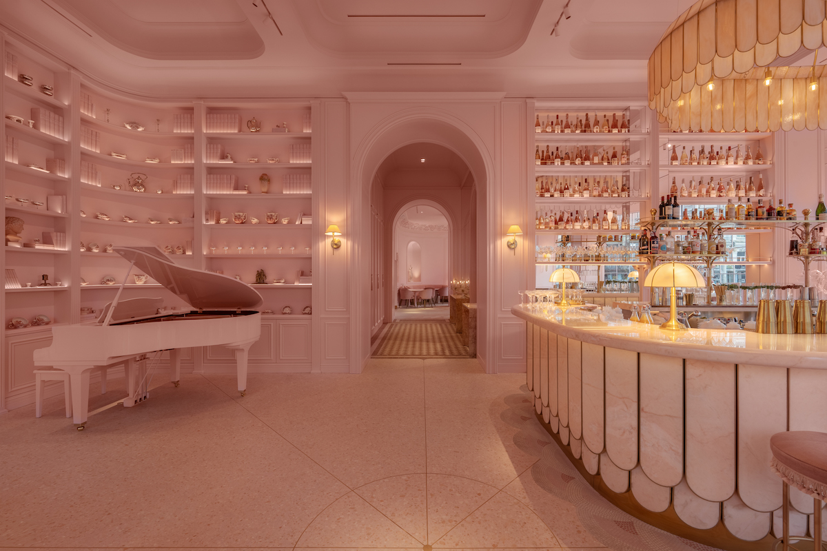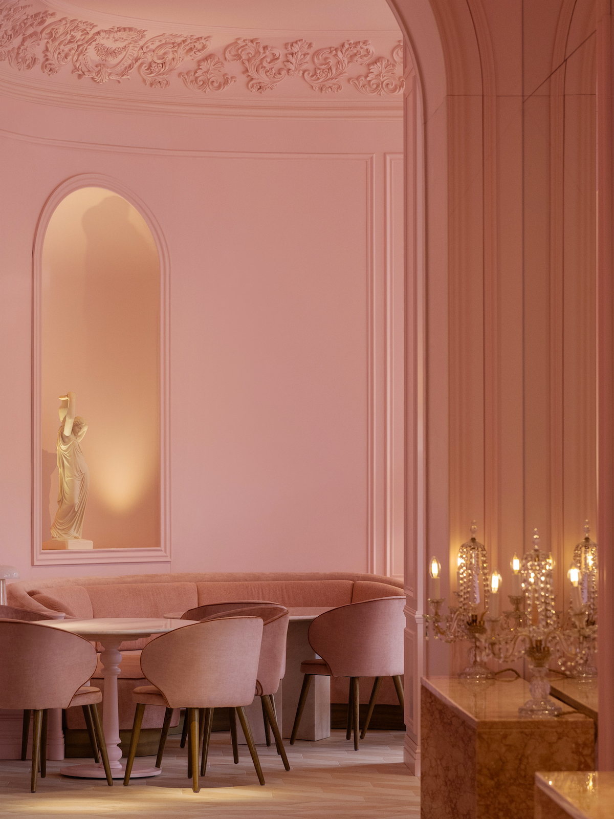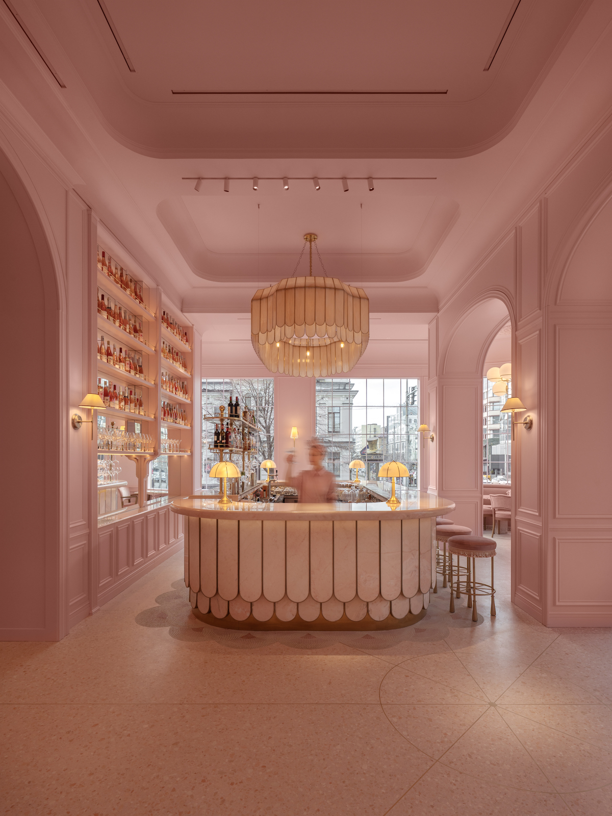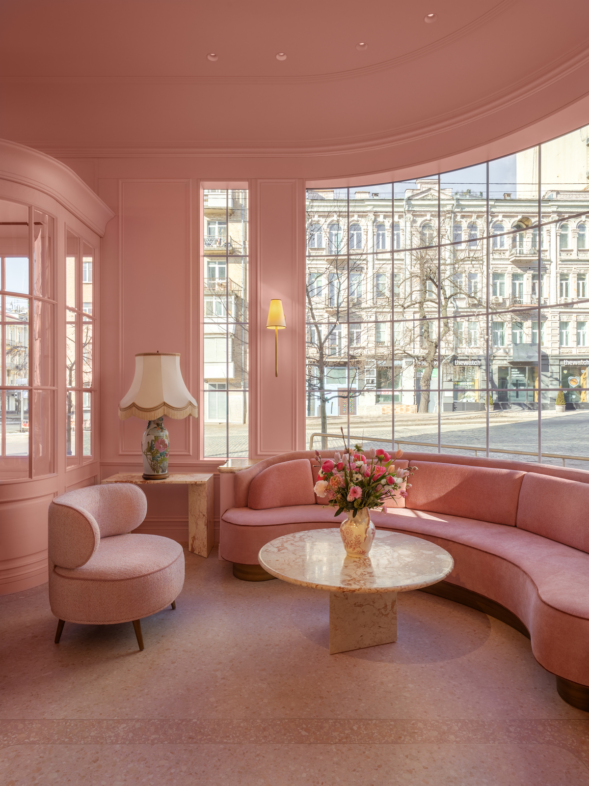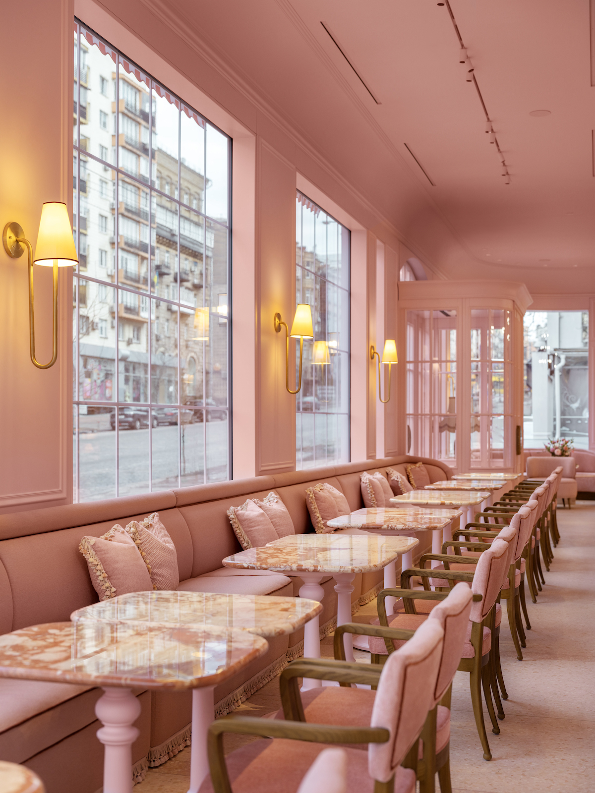 Дизайн закладу площею 300 квадратних метрів розробляла студія NEMOV, яка стверджує, що «переосмислила рожевий колір, перетворивши його на складний архітектурний матеріал».