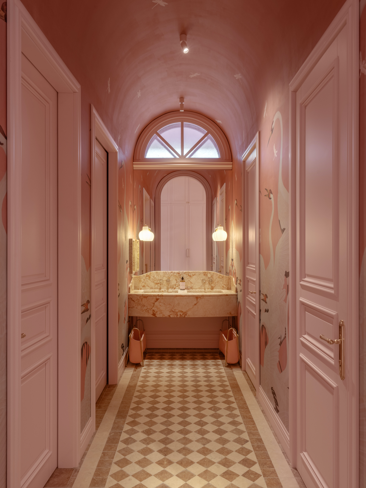 Інстаграмною зоною слугує гардеробна кімната з вінтажним муранським дзеркалом. Для вбиралень студія використала рожеві, зелені та винні шпалери Gucci, що вкривають і стіни, і стелі.