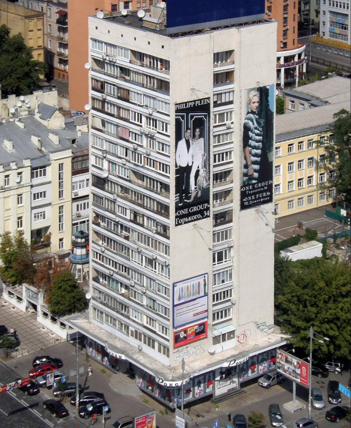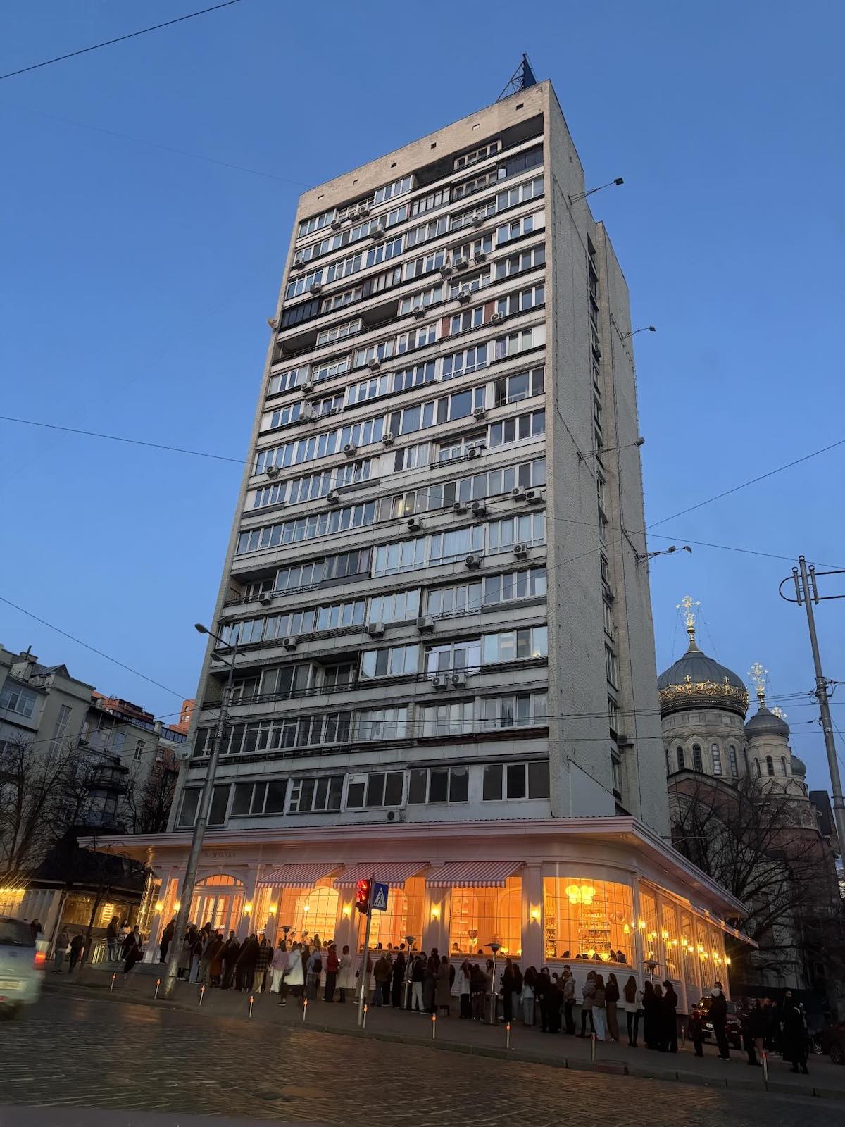 Будинок 1969 року, в якому розташовано заклад — перший у Києві 16-поверховий цегляний будинок.