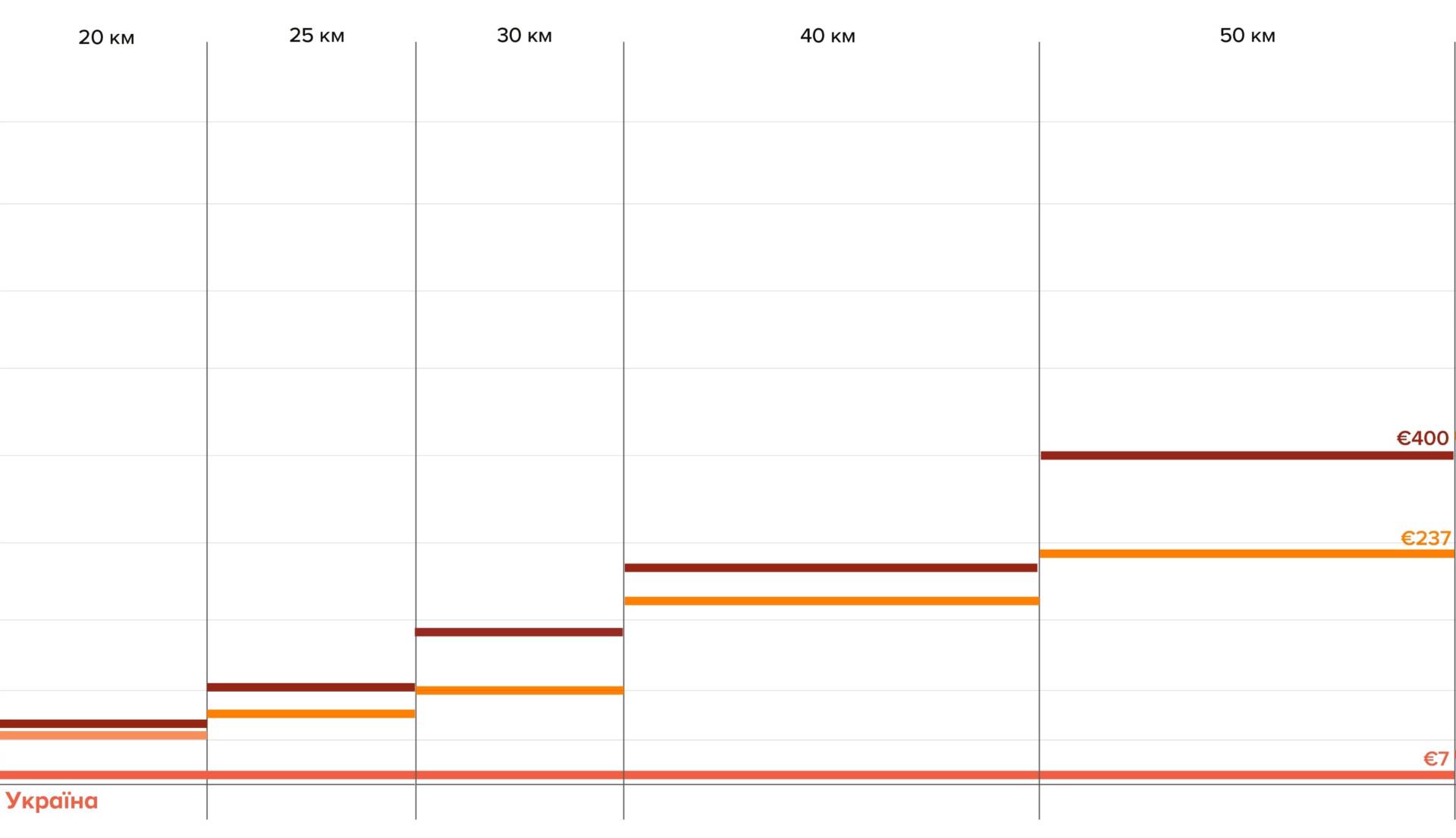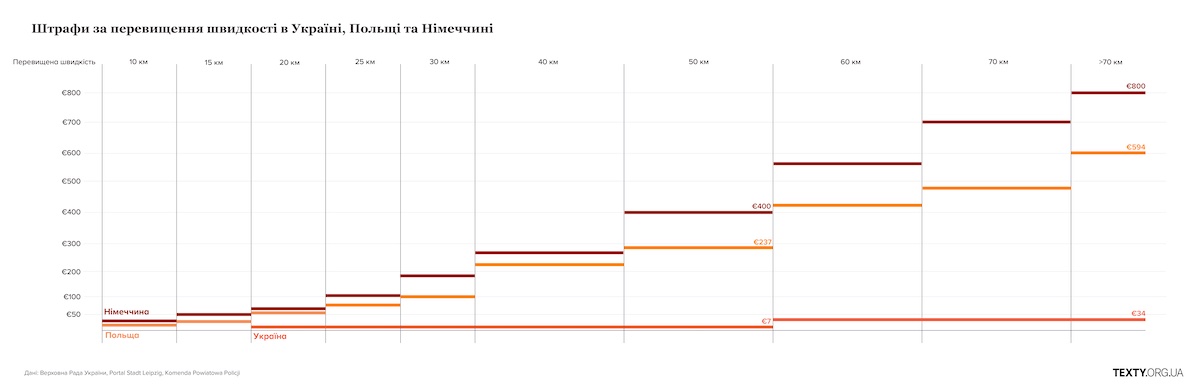 Український водій, який перевищує швидкість на 80 кілометрів, отримує штраф у 34 євро. Німецький водій за подібне отримає 800 євро штрафу та штрафні бали. Порівняльну інфографіку створили TEXTY.
