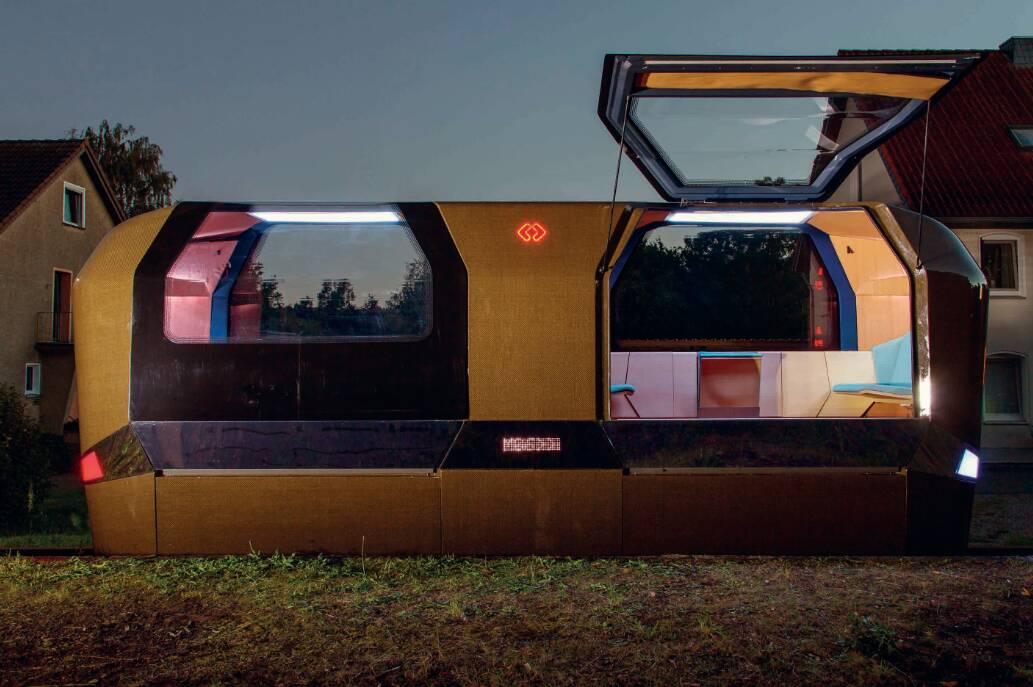 Зовнішній корпус виготовили з натуральних волокон льону та біосмоли, що робить його дуже легким та міцним. В інтер’єрі використали поєднання гнутої ясенової фанери, коркового покриття для підлоги, яке гасить вібрації, та спеціального нейлону з вторинної сировини. Такий вибір матеріалів підкреслює зв’язок футуристичного транспорту з сільським ландшафтом, через який він курсує.