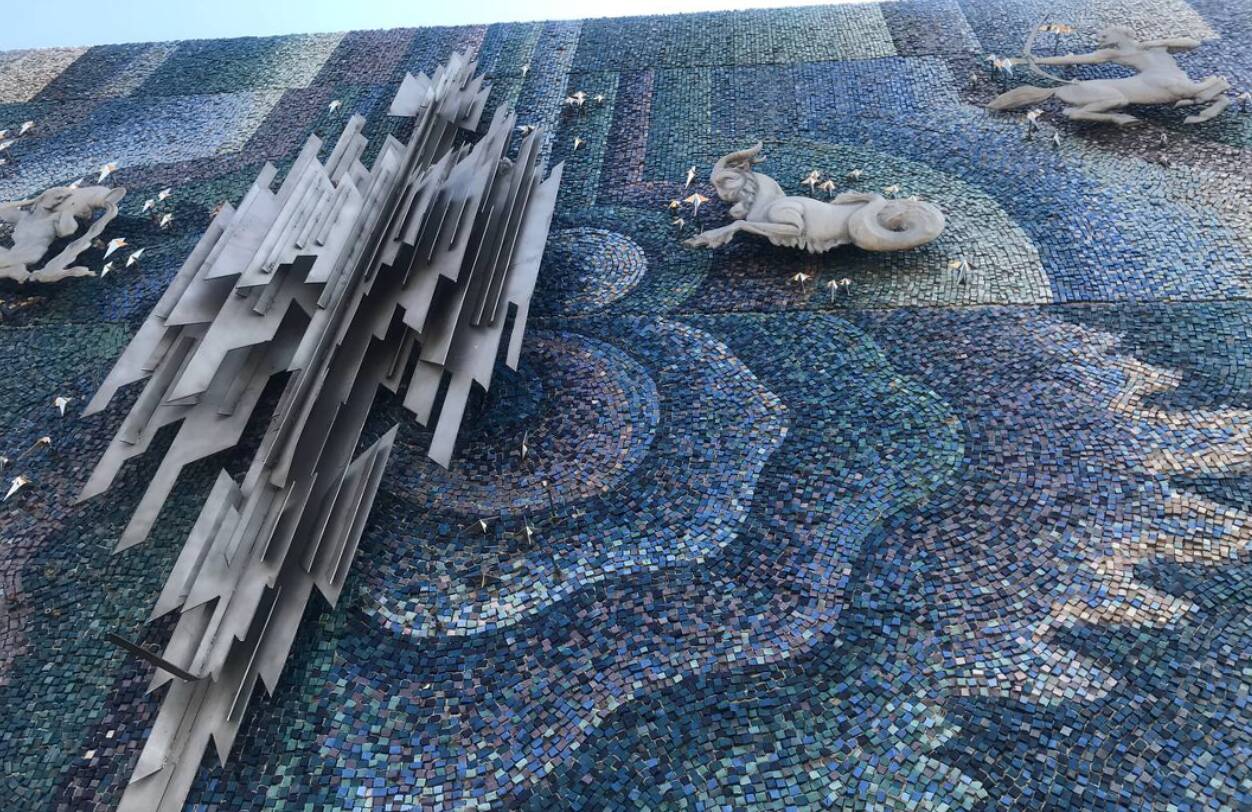 Чотири майстри-мозаїчники викладали полотно «Сузір’я космосу» шматок за шматком вручну. Окрім зовнішнього фасаду, всередині занедбаної будівлі збереглася ще одне керамічне панно, наразі невідомо, що буде з ним.