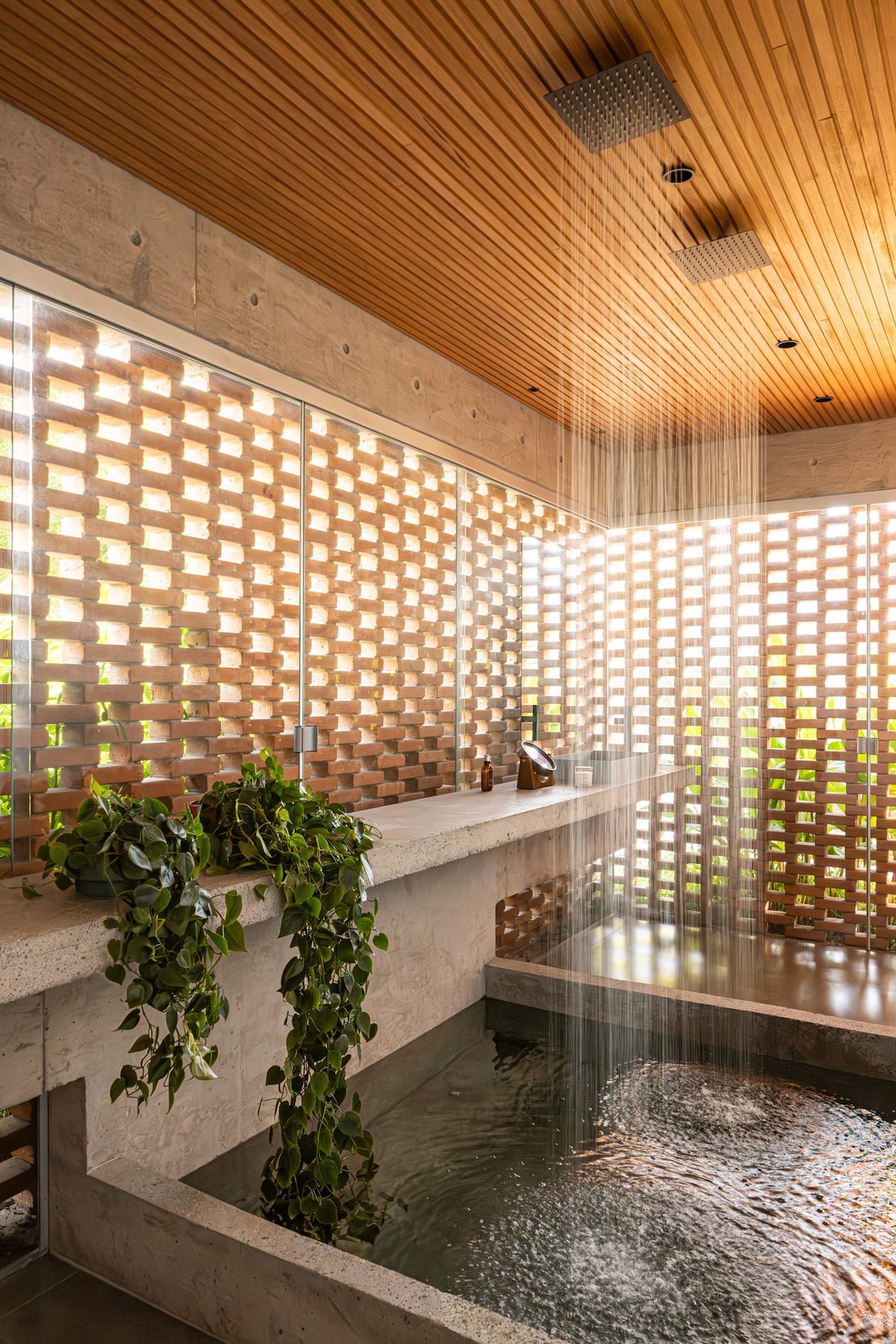В інтер’єрі у вічі впадає душ, що нагадує тропічний водоспад.