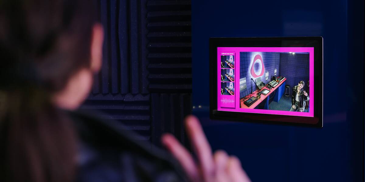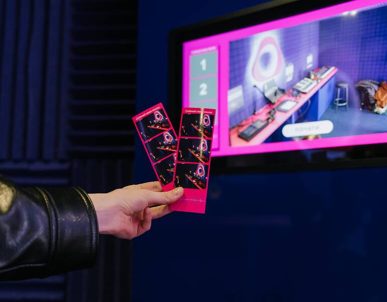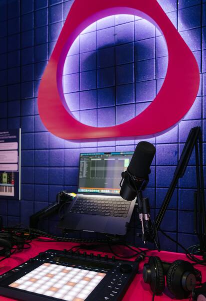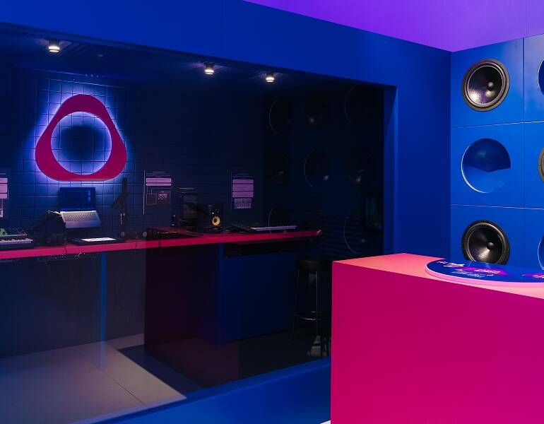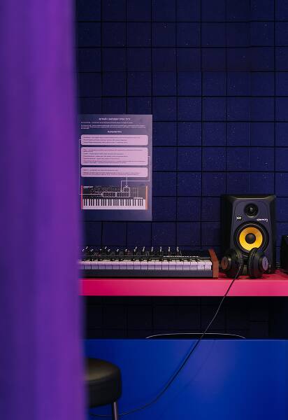 Ідеї самі по собі — це ще не все. Їм потрібен простір, де вони починають працювати. Саме таким місцем став неоново-фіолетовий Куб IQOS у ТРЦ Respublika Park. Це поп-ап, на якому є точка продажу та кімната, облаштована FUSION JAMS під звукозаписувальну студію. Можна відчути себе, як у якомусь американському фільмі про музикантів.