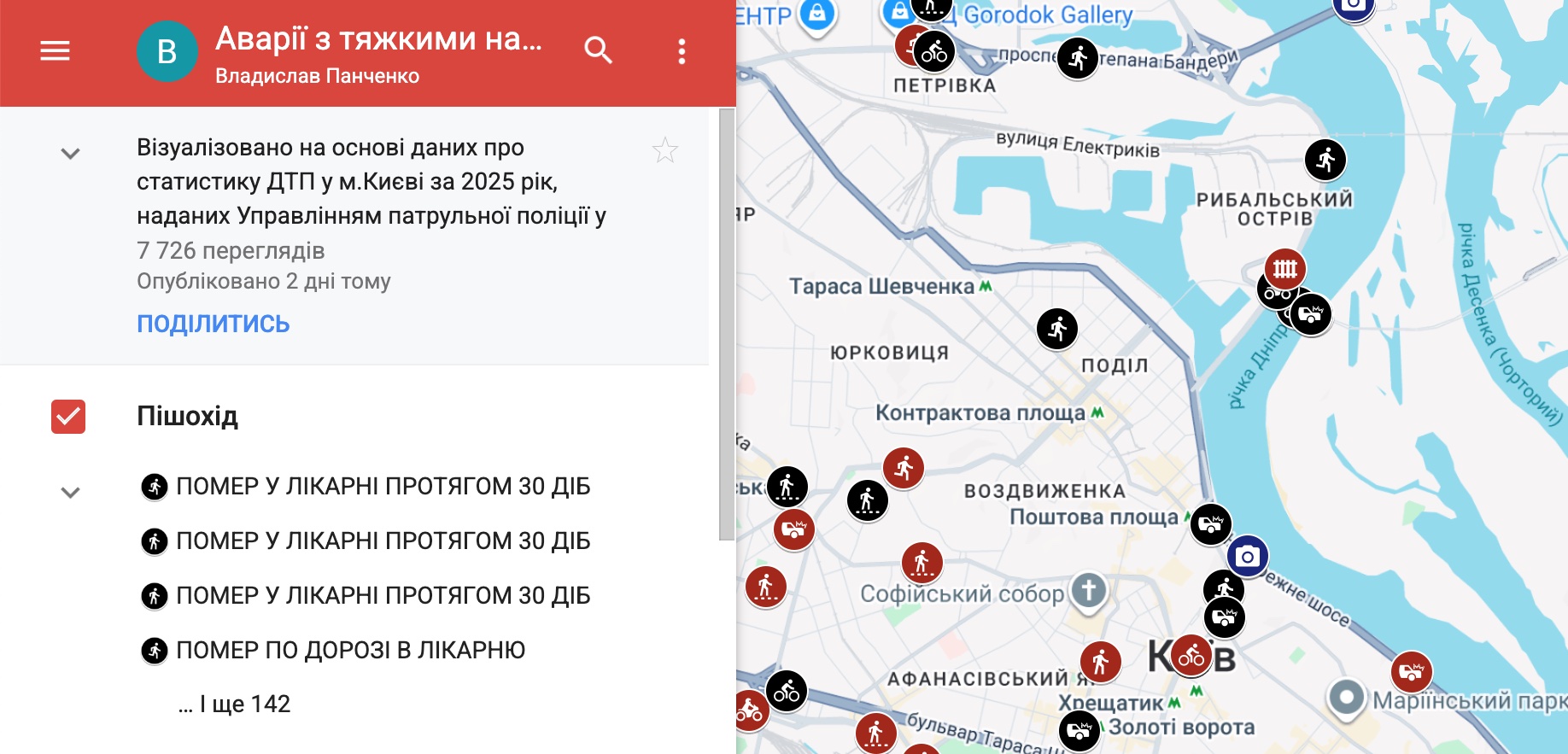 U-Cycle (ГО «Асоціація велосипедистів Києва») створила інтерактивну мапу дорожніх аварій у Києві з тяжкими наслідками. Автори — Влад Панченко і Гліб Косяченко — використали статистику патрульної поліції за 2025 рік.