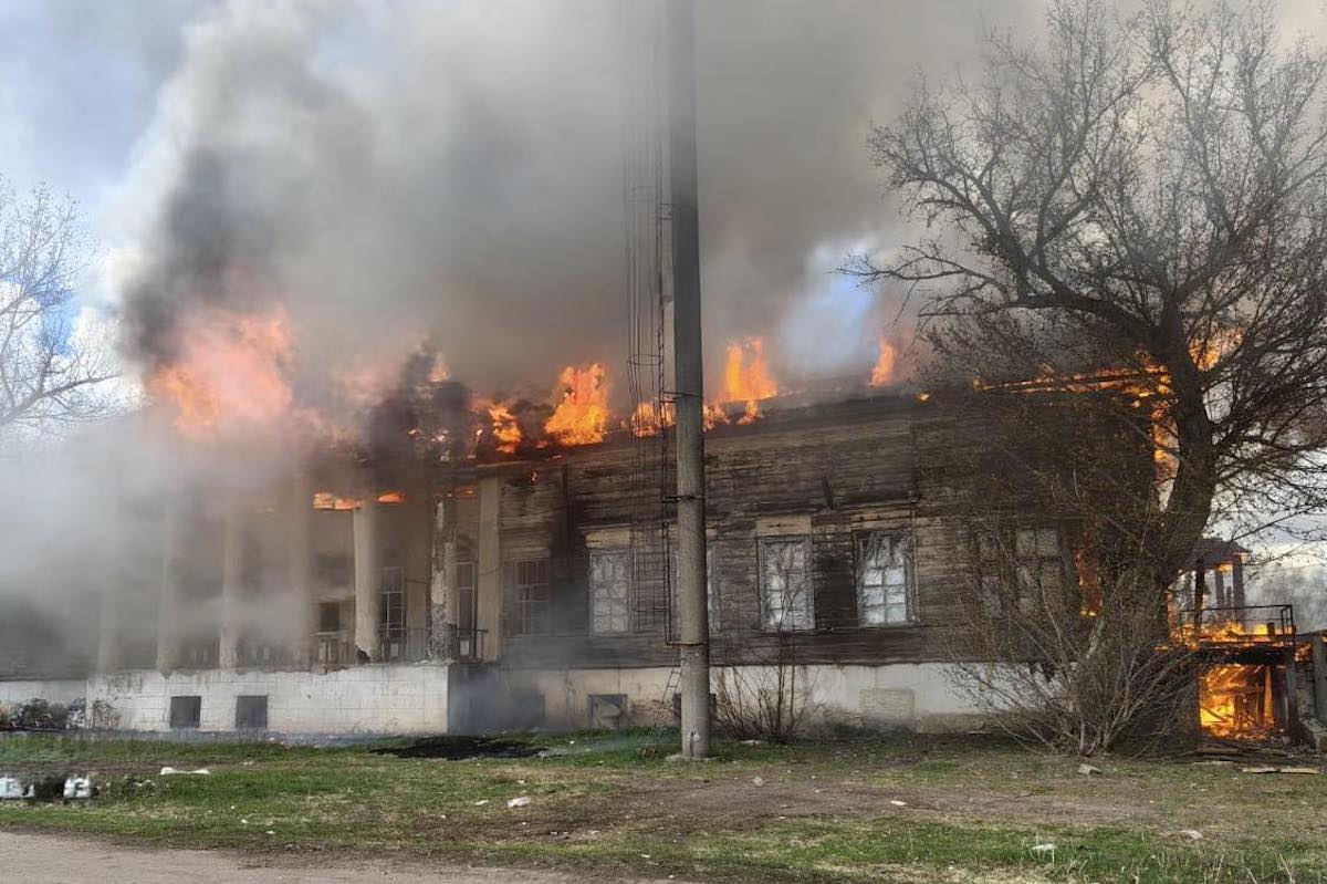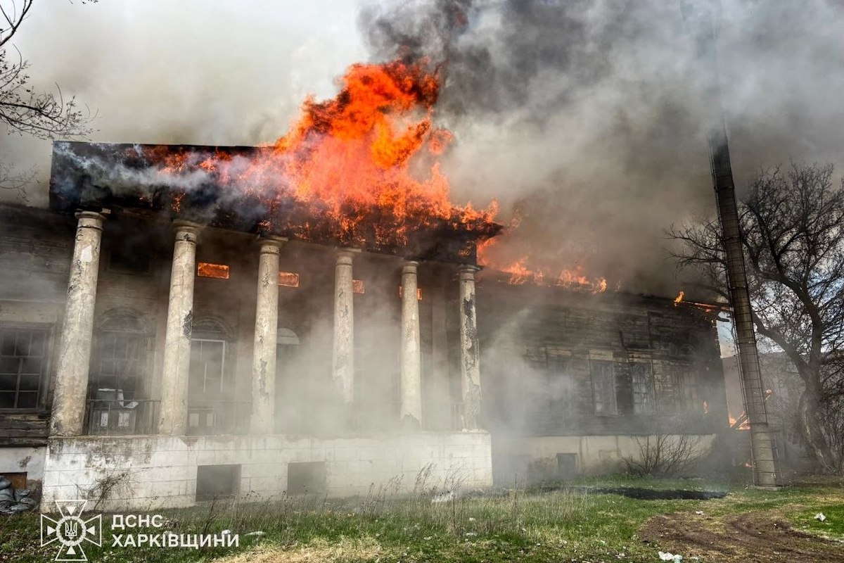 Сьомого квітня два російські безпілотники «Герань-2» влучили в історичну садибу Донців-Захаржевських на Харківщині. Пам’ятка архітектури ХІХ століття згоріла.