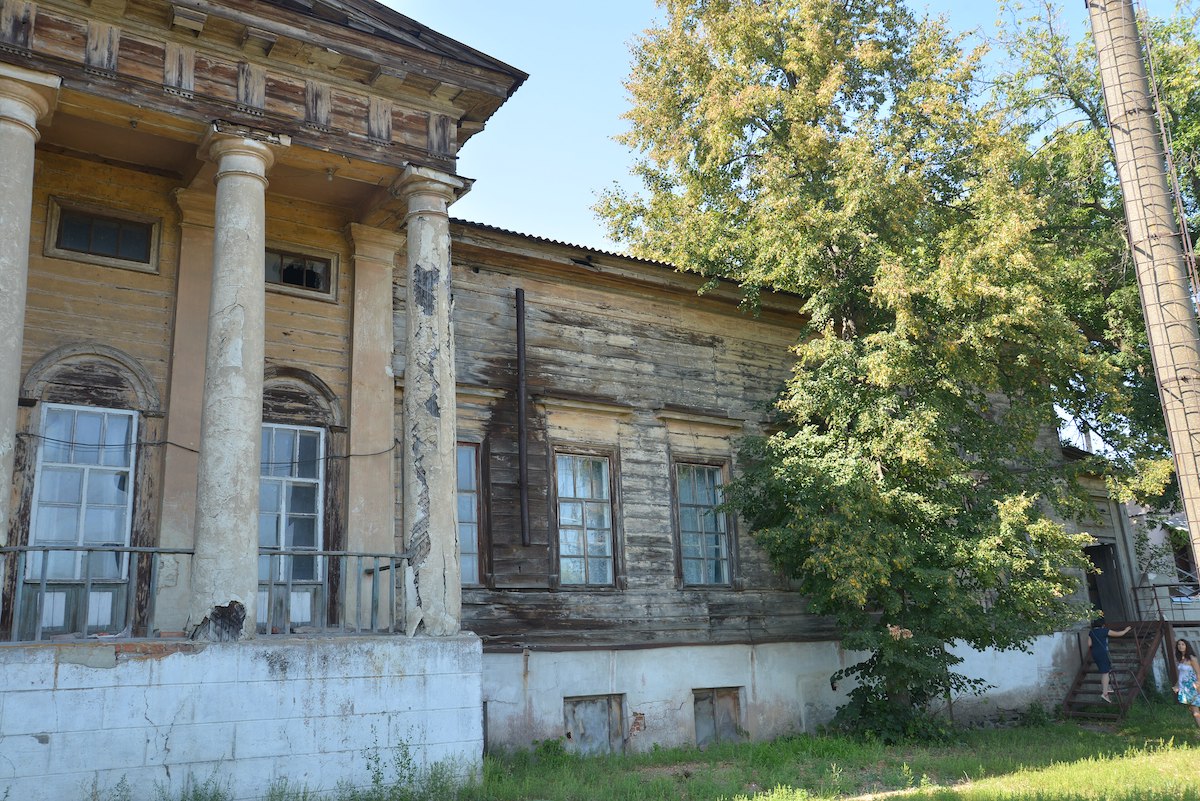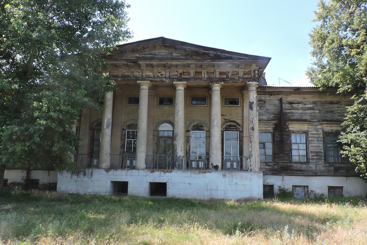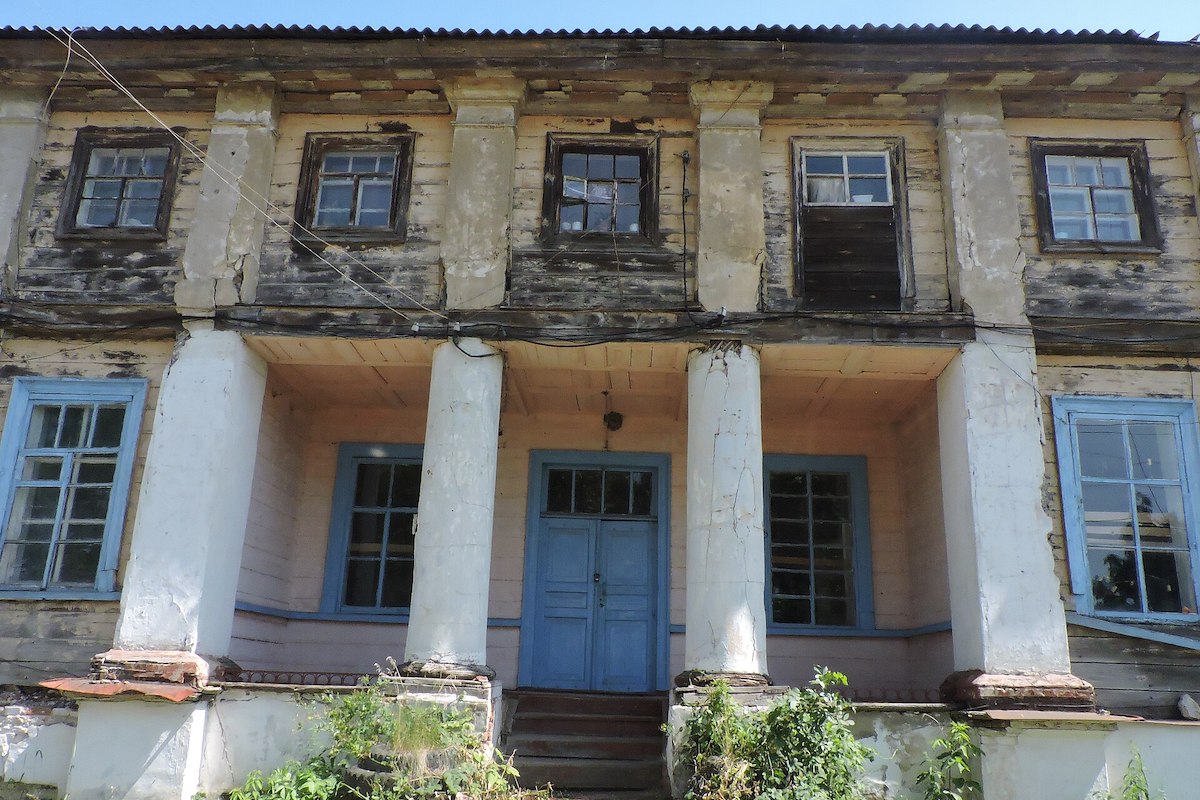 Особливість будинку в тому, що класицистичну споруду з характерним портиком і доричною колонадою виконано з дерева на кам’яному фундаменті. Мистецтвознавець Лукомський писав, що будівля «справляє враження кам’яної, так ідеально підігнані дошки обшивки, такий підібраний чистий ліс».
