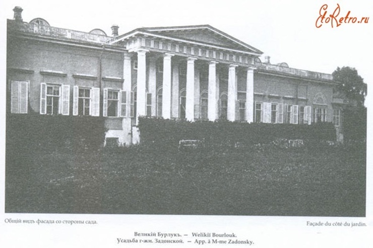 Двоповерхову садибу зведено 1835 року в селищі Великий Бурлук. До родини Донець-Захаржевських, яка володіла цими землями, у XVIII столітті приїздив філософ Григорій Сковорода.
