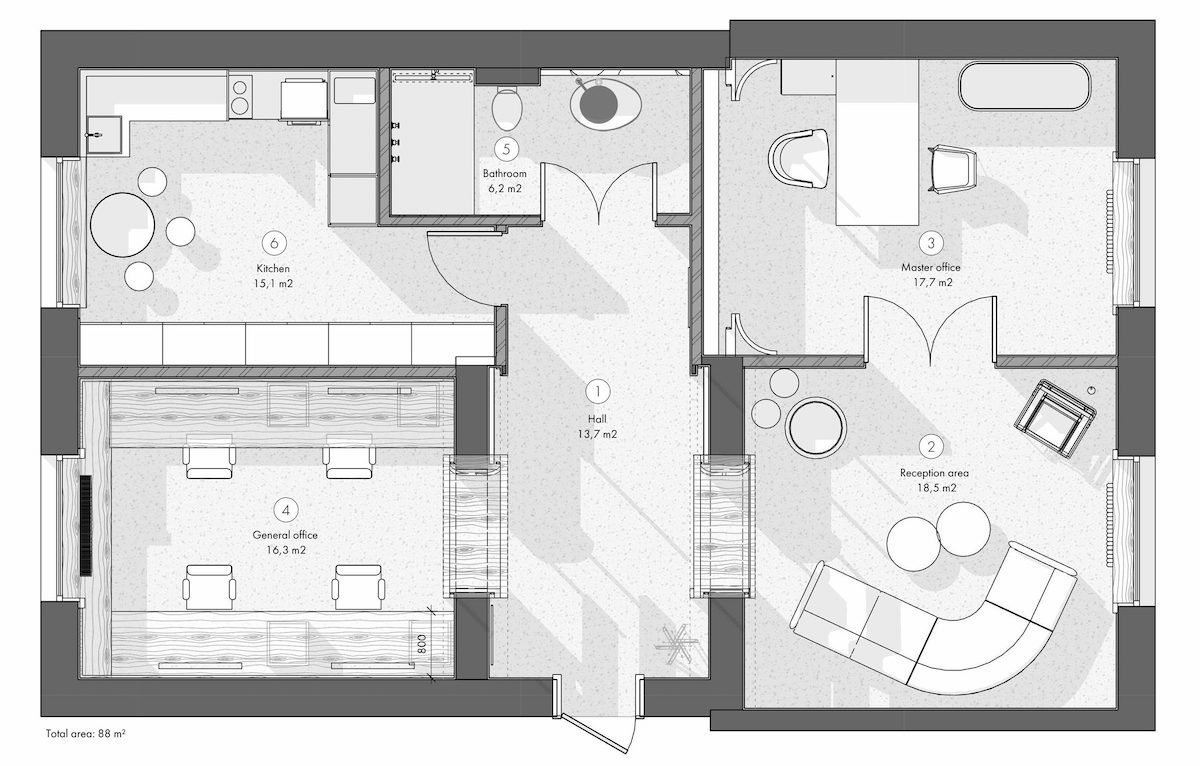 Раніше у цьому приміщенні площею 88 квадратних метрів було розташовано квартиру. Тепер тут розмістився офіс команди нотаріуса Анни Бакай.