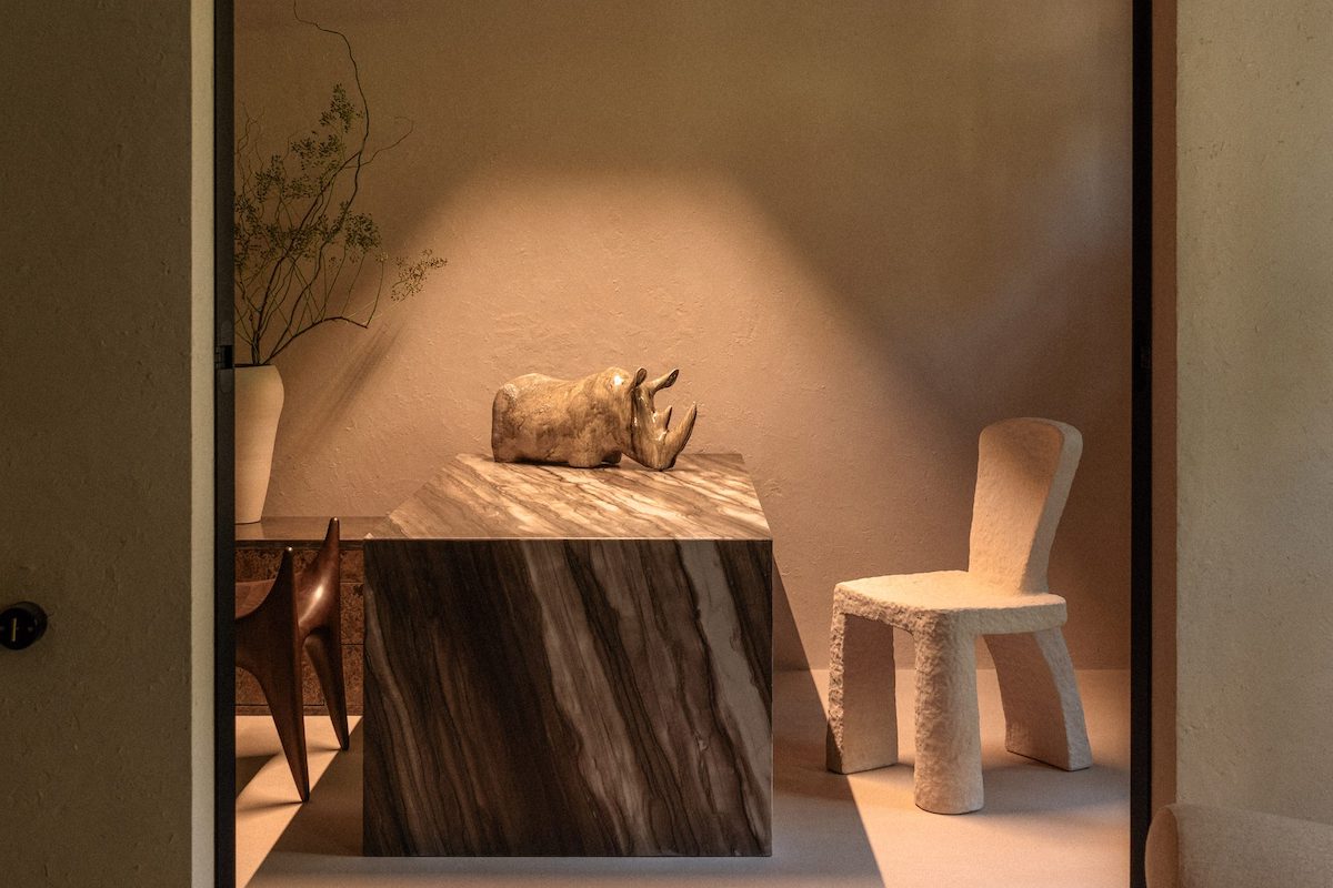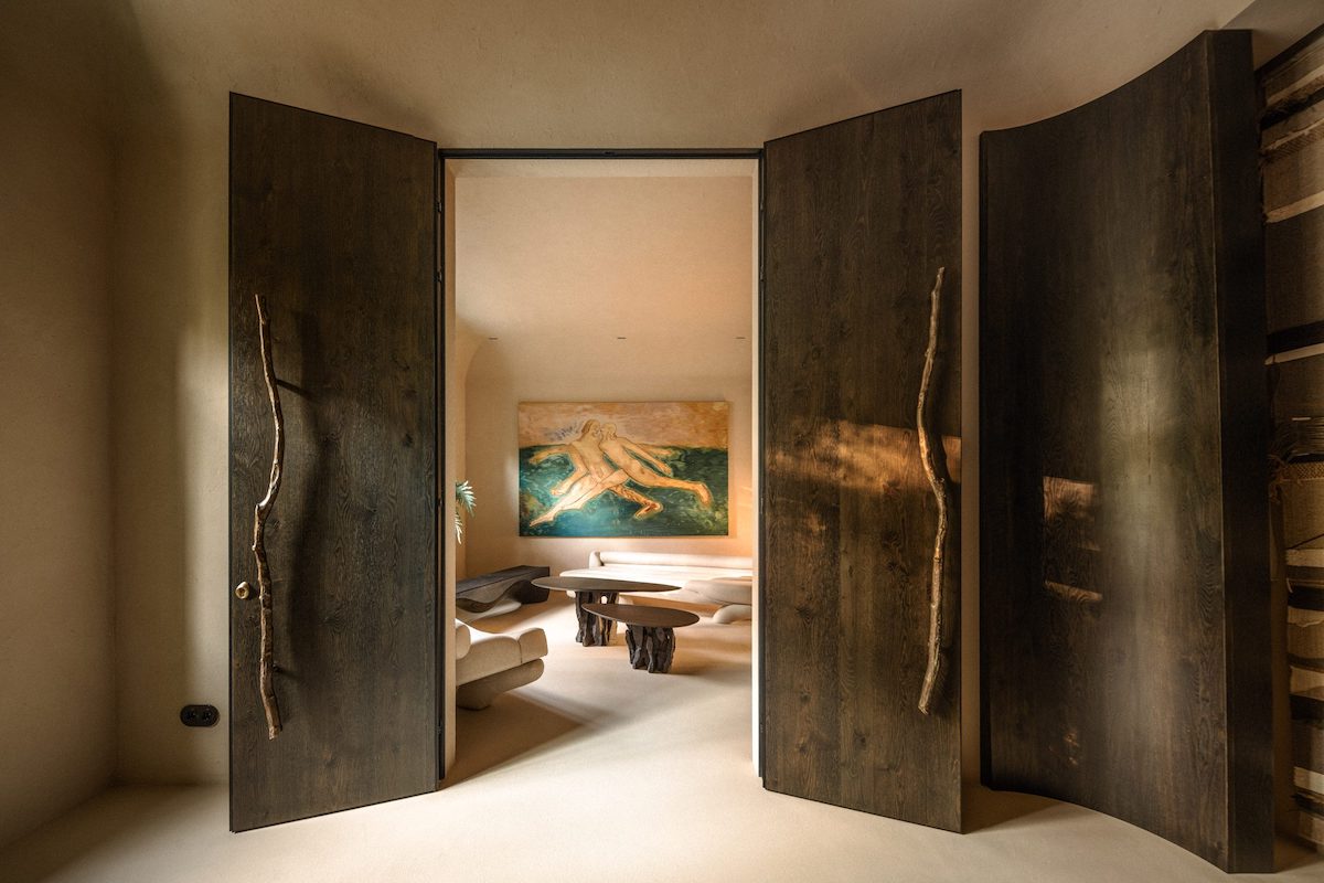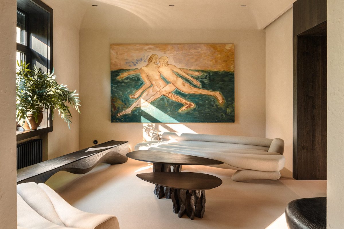 У приймальні розміщено колекційні меблі: дивани з серії Zemna Тетяни Красуцької; журнальні столики з текстурованими керамічними основами від Naturaceramica; скульптурні сидіння італійського бренду Riva 1920, виготовлені з масиву переробленої деревини.