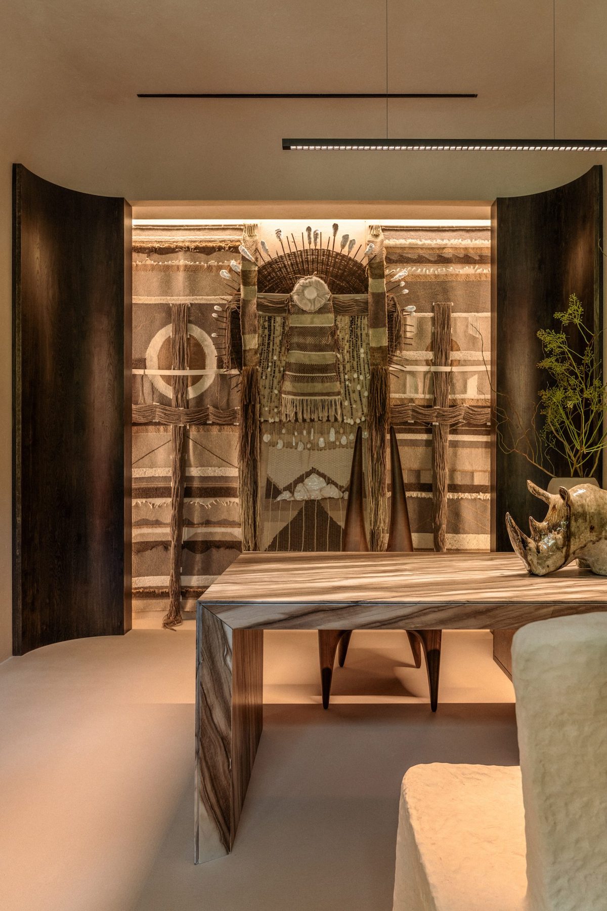Кабінет власниці бізнесу прикрашено текстильним панно з керамічними деталями, яке створила художниця Оксана Левченя спеціально для цього проєкту. У центрі стоїть стіл із кварциту з прожилками, візерунок яких нагадує дерево секвої.