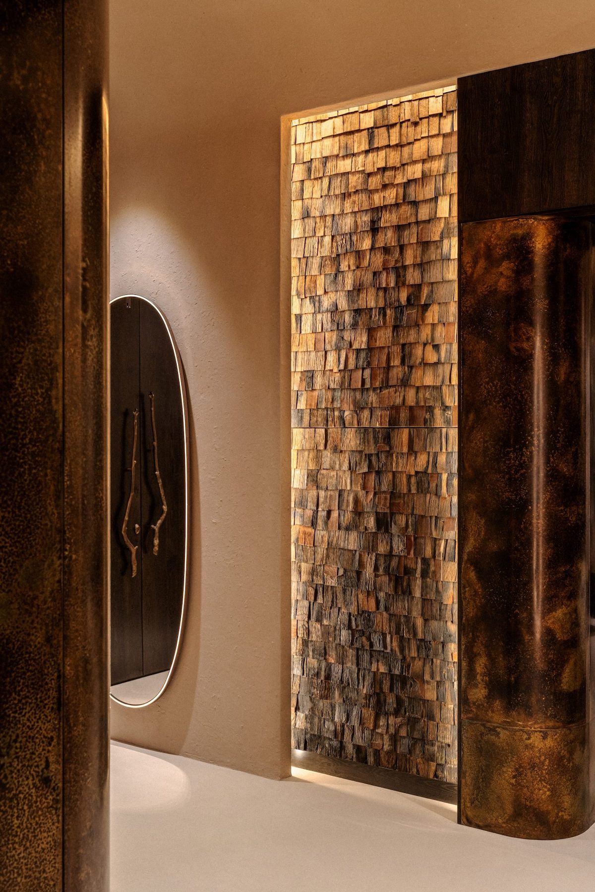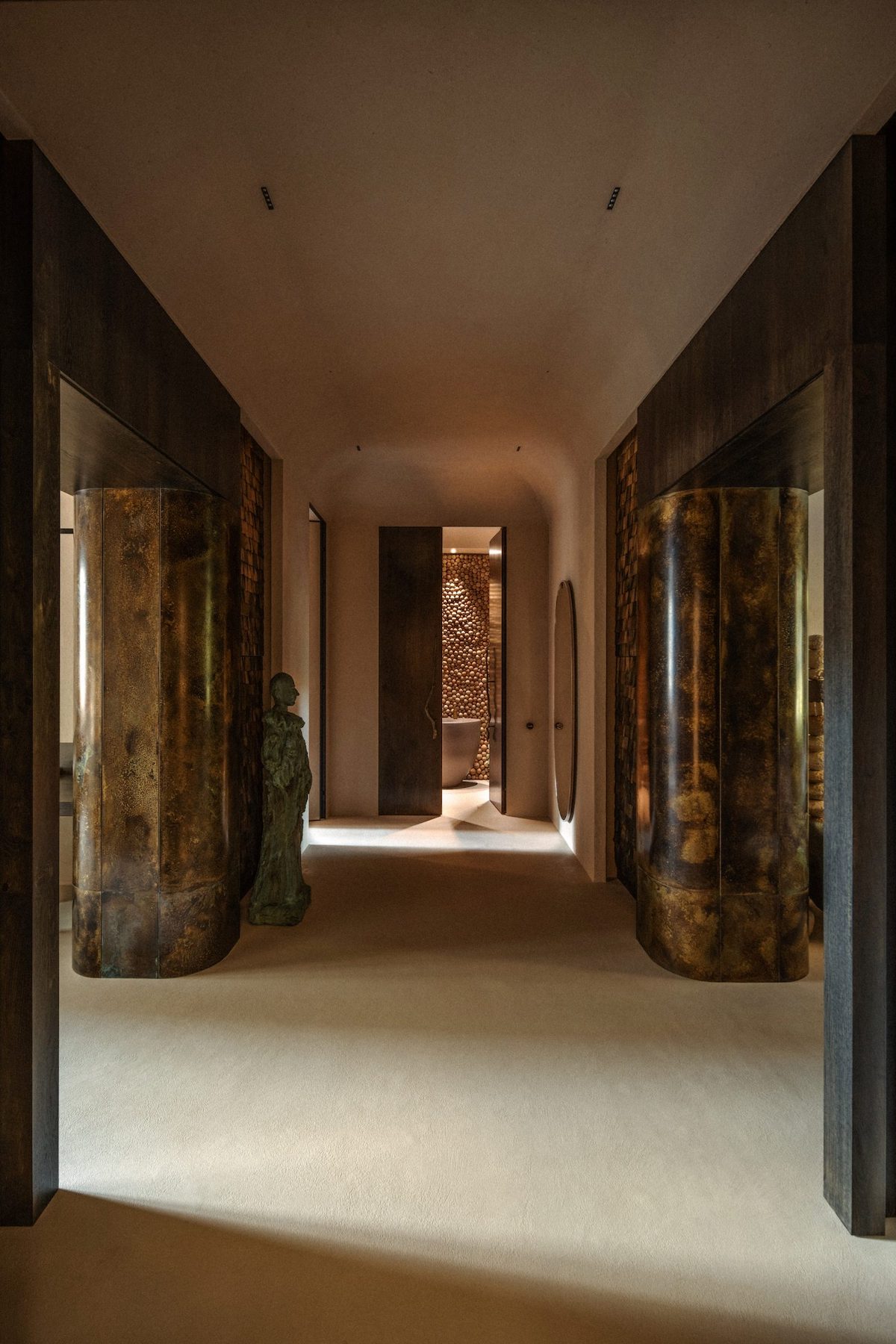 Коридор-галерею прикрашено панелями з ґонту. Скульптор і художник Андрій Возницький виготовив їх із деревини, переробленої з винних та пивних бочок. Тут також розмістили скульптуру Олександра Сухоліта. Вішак для одягу від бренду Mogg зроблено у вигляді спалених сірників.
