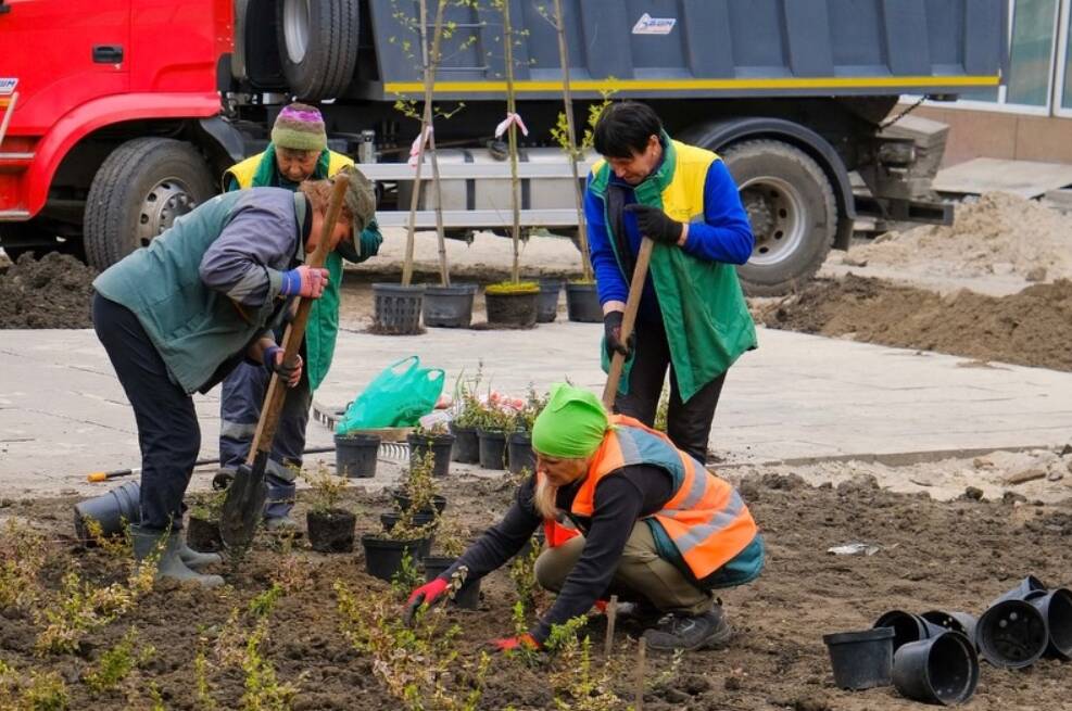 На проспекті Повітряних Сил, 15–19 комунальники озеленюють територию.