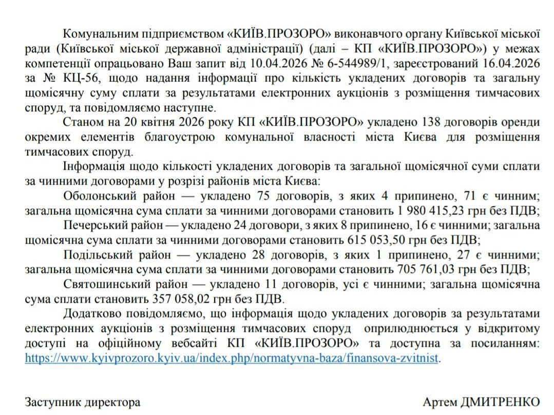 Київ наразі уклав 125 чинних договорів оренди на розміщення МАФів. Про це йдеться у відповіді КП «Київ.Прозоро» на запит киянина Павла Постоєнка.