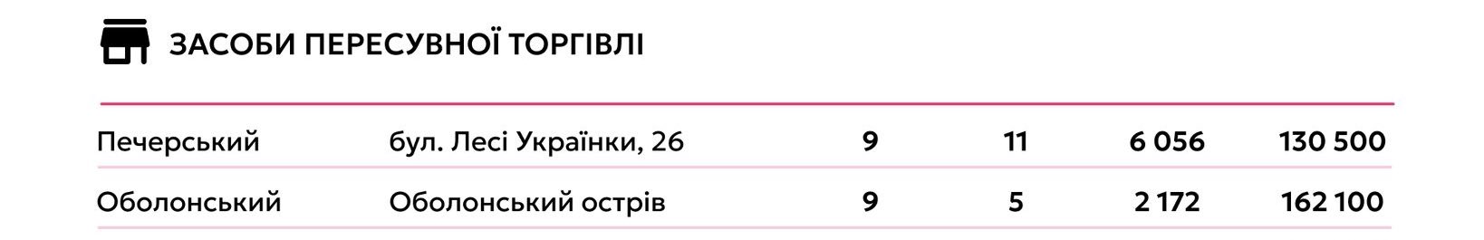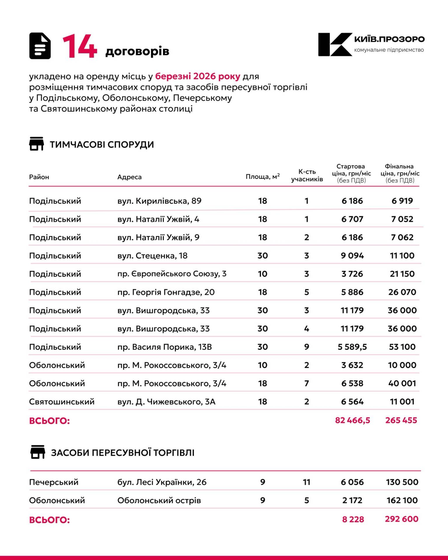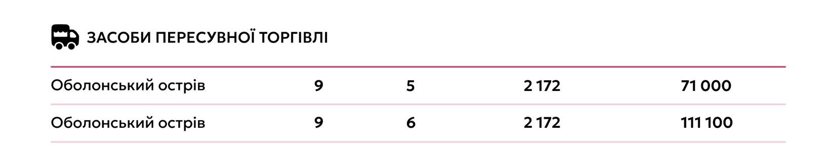 Комунальне підприємство також публікує вартість оренди кожної з локацій. Найвищу ціну платять власники трьох пересувних кіосків на Оболонському острові — 71 тисячу, 111 тисяч і 162 тисячі гривень на місяць.