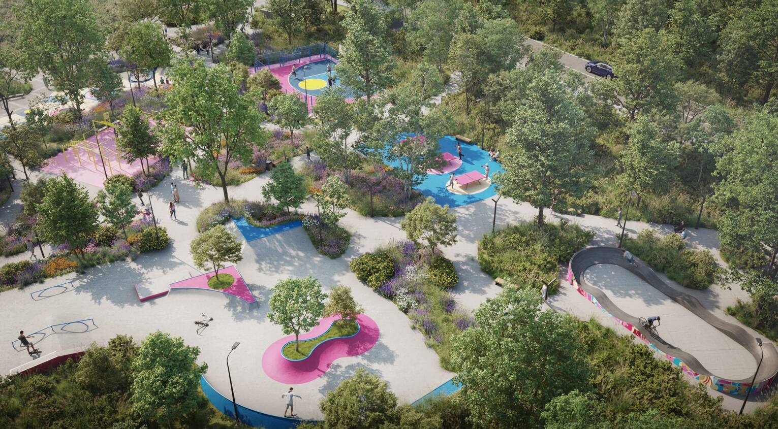 Концепція парку передбачає створення багатьох функціональних зон на одній території. Тут облаштують мультикорт для волейболу, бадмінтону, баскетболу та стрит-футболу.
