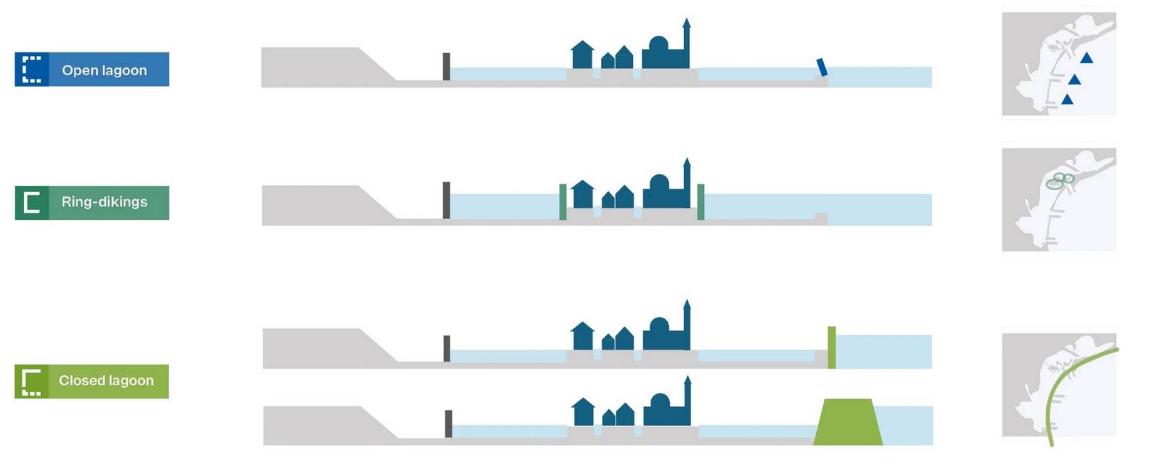 Друга стратегія, «кільцеві дамби», передбачає будівництво захисних мурів безпосередньо навколо історичного центру та інших поселень, щоб ізолювати їх від води. При цьому сама лагуна залишатиметься відкритою для моря. Це дозволить зберегти будинки, пам’ятки та більшість бізнесів, не вдаючись до постійного перекриття морських входів бар’єрами MoSE. Екосистема лагуни за такого сценарію розвиватиметься природно, без втручання інженерних споруд.