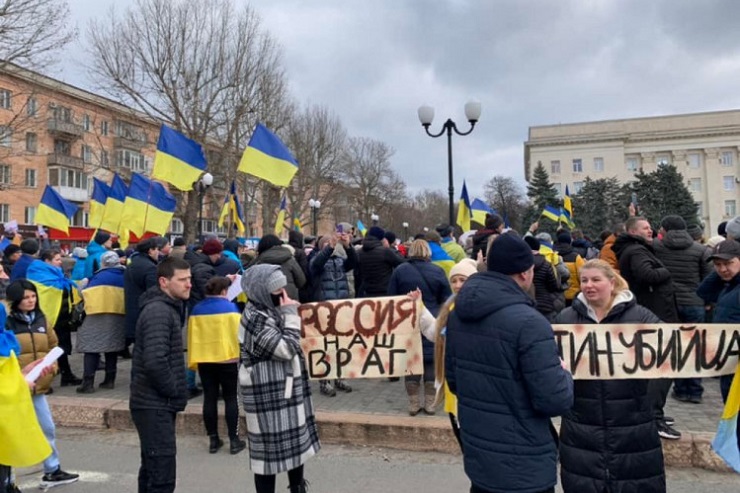 У Херсоні тисячі мирних жителів з українськими прапорами вийшли на мітинг проти окупантів Крутько Дар'я · 5.3.2022 · 13:53 ВійнамітингХерсон